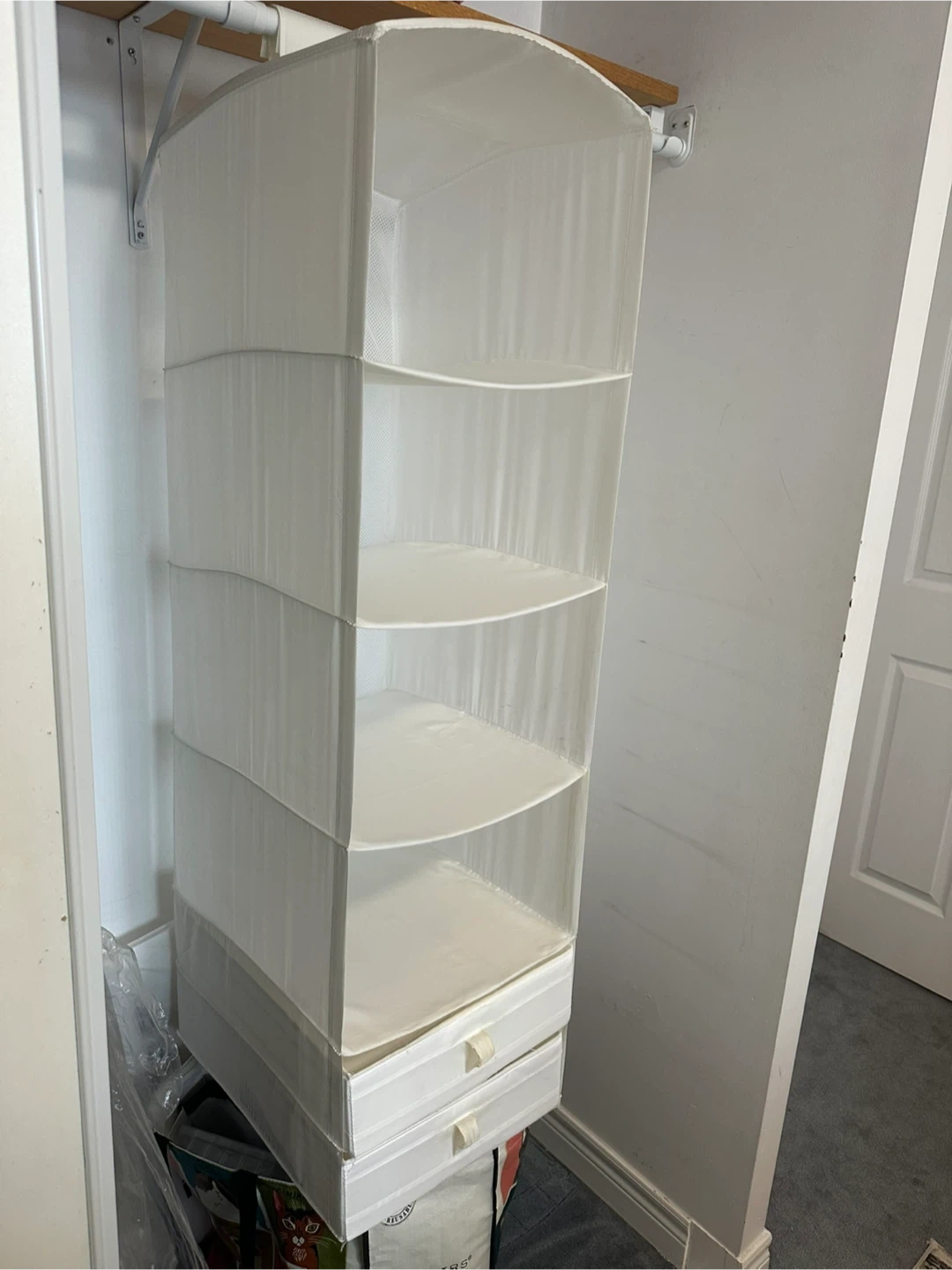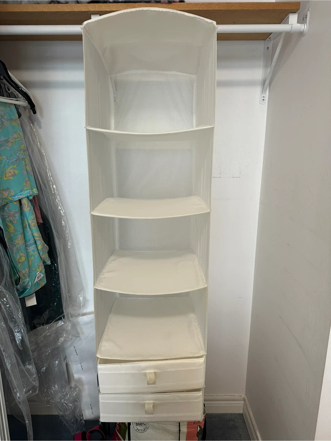 Declutter your closet with this handy hanging storage unit! It features multiple shelves and drawers, perfect for organizing clothes, accessories, or anything else you need to keep tidy. It's ready to help you maximize your closet space