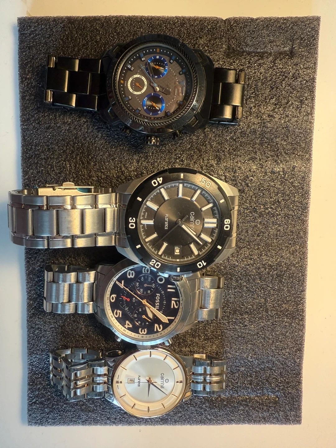 Selling a collection of watches including Fossil and Cairnhill brands. They are in good condition and ready for a new home! 1️⃣ Cairnhill Black Diver Style • Brand: Cairnhill • Condition: Brand New – Never Used • Features: Water resistant, Japan quartz, diver-style bezel, stainless steel bracelet, date function 🛒 Market Price: $100+ 💰 My Price: $65 ⸻ 2️⃣ Cairnhill Classic White Dial • Brand: Cairnhill • Condition: Very Good – Few Times Used • Features: Elegant silver & gold-tone bracelet, Japan quartz movement, date display 🛒 Market Price: $90 💰 My Price: $55 ⸻ 3️⃣ Fossil Chronograph Blue Dial • Brand: Fossil • Condition: Excellent – Few Times Used • Features: Stainless steel bracelet, bold blue dial with large numerals, chronograph design 🛒 Market Price: $150+ 💰 My Price: $70 ⸻ 4️⃣ Fastrack Chronograph Black • Brand: Fastrack (Titan Group) • Condition: Used – Like New • Features: Stylish black stainless steel, sporty blue sub-dials, durable build 🛒 Market Price: $70+ 💰 My Price: $40 ⸻ For all together 250 if u buy together ★ 📍 Location: Scarborough – Midland & Kingston Rd