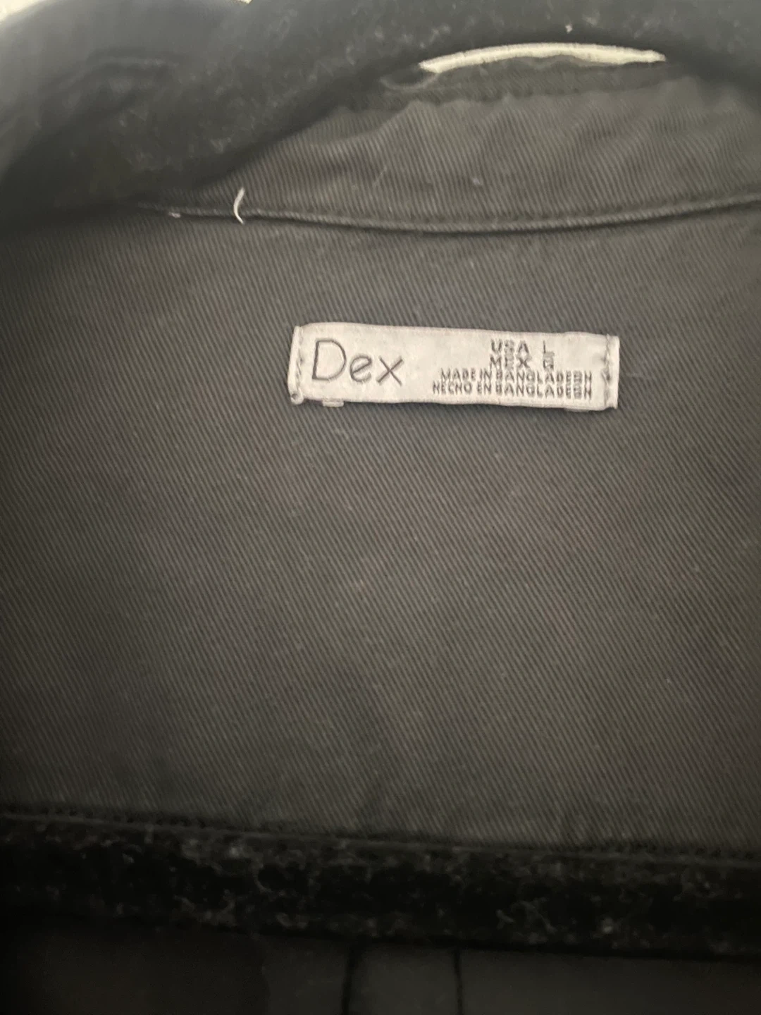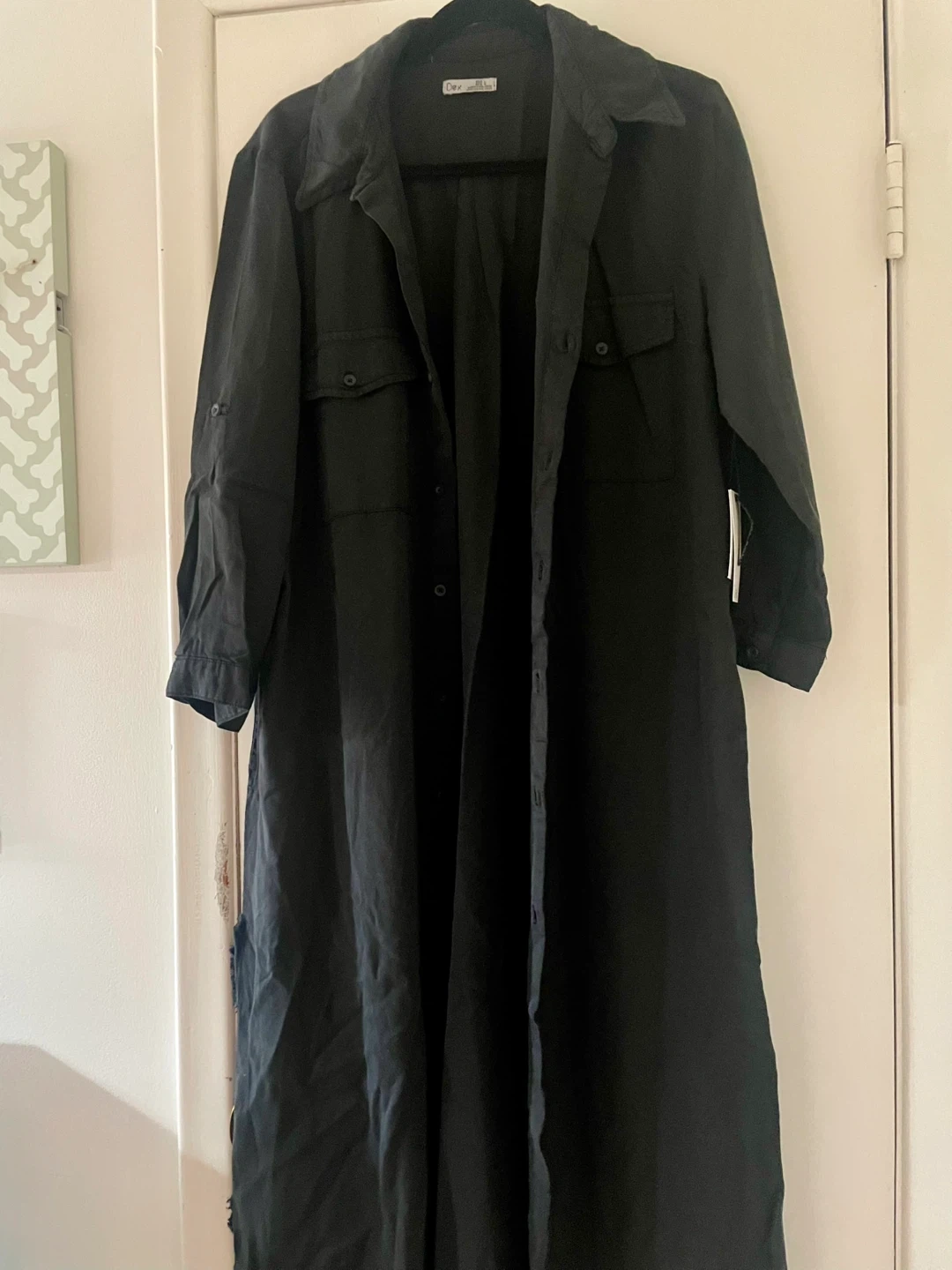 Selling a Dex black dress in size L. It's made from a comfortable linen blend, perfect for warmer weather. The dress features a button-down front and long sleeves that can be rolled up. It's in great condition and ready for a new home!