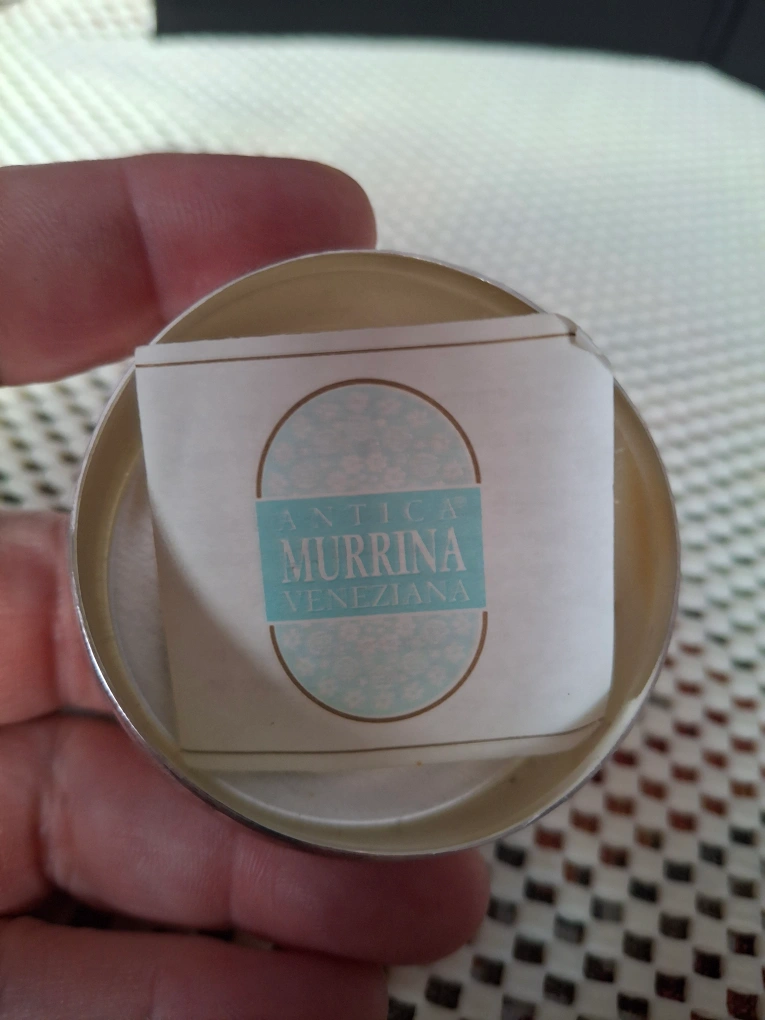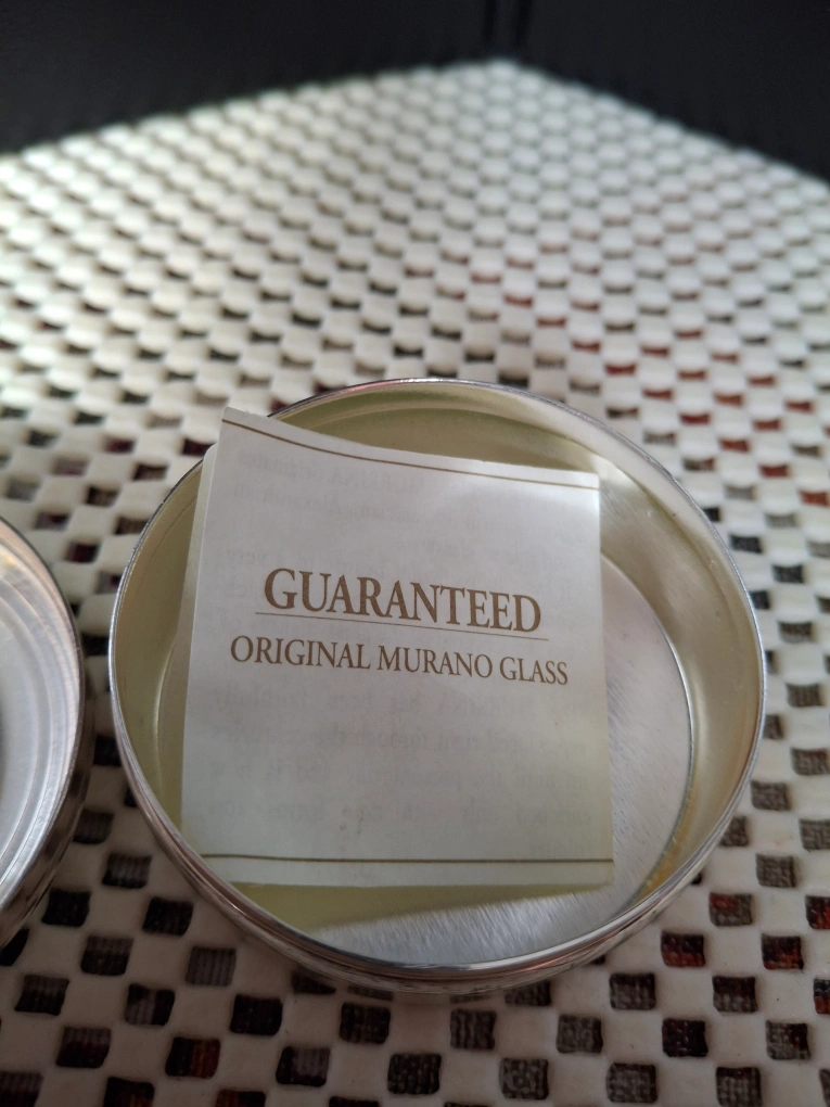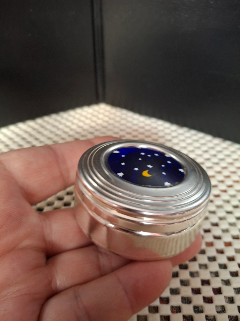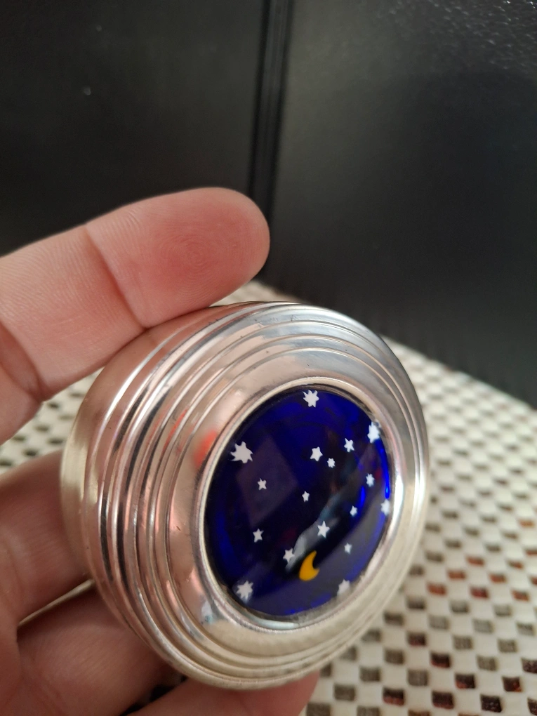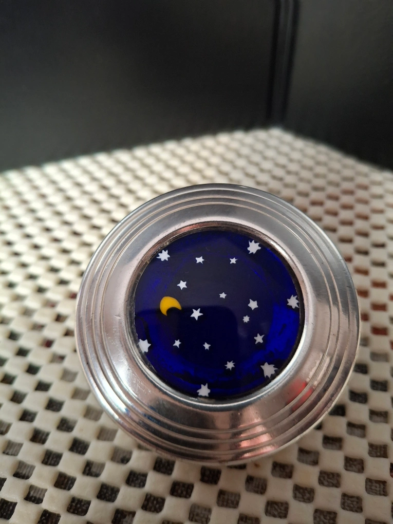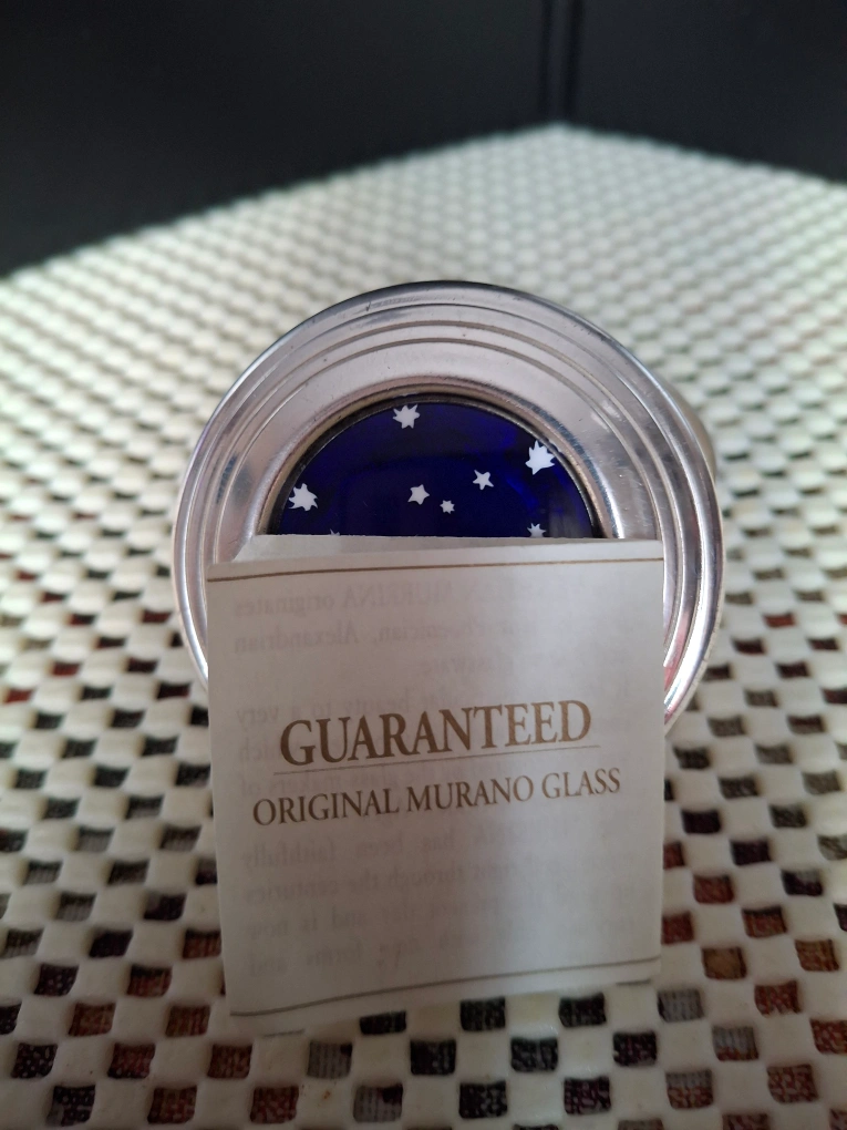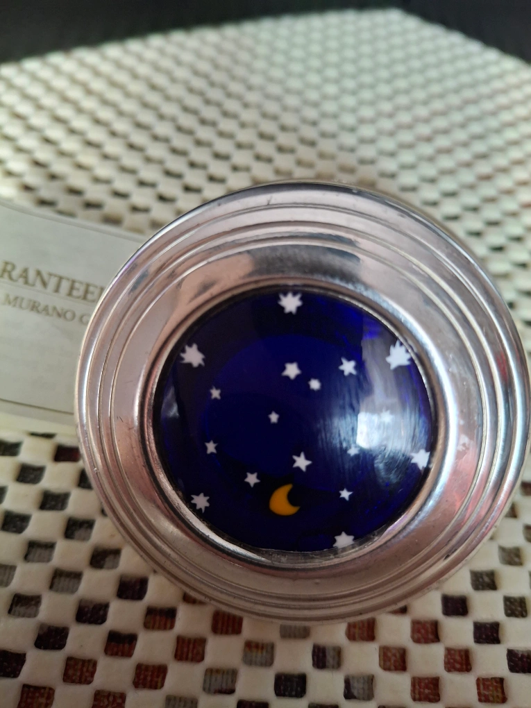 Cute little pill box featuring a dark blue starry night design! It has a silver-tone metal casing and is in great condition. The label says 'Guaranteed Original Murano Glass'