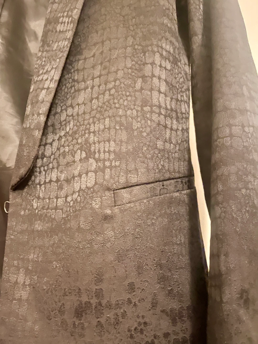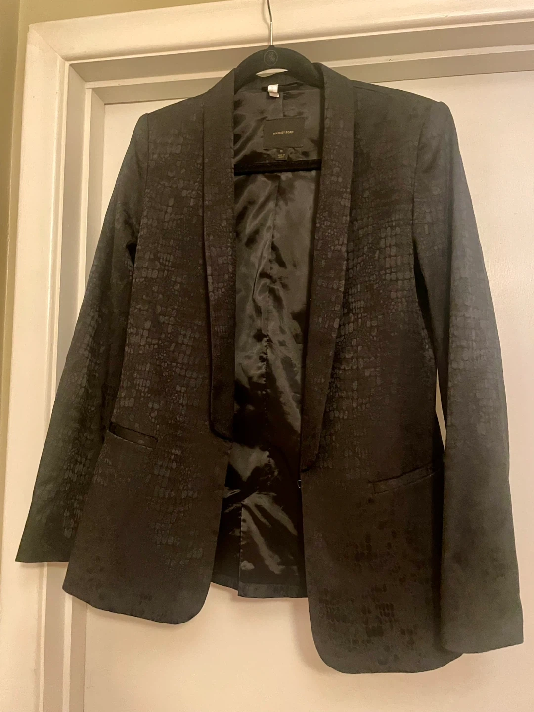 Selling a stylish black blazer from Dynamite! It features a unique textured pattern and is a size small. Perfect for dressing up or down!