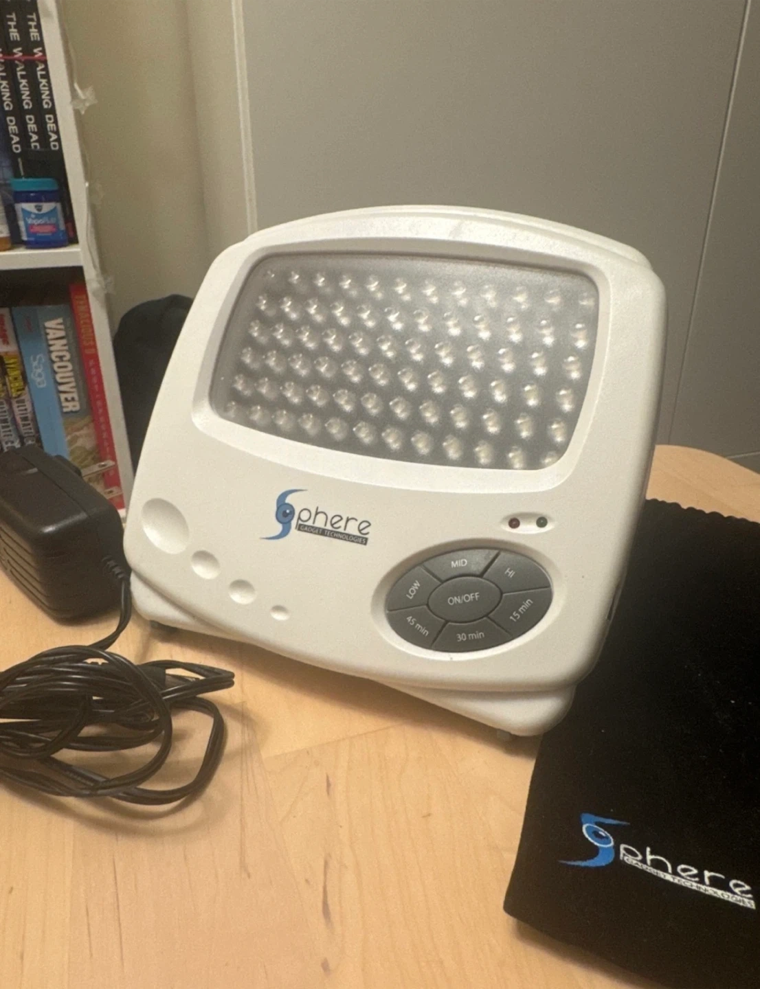 Sphere Gadget Technologies light therapy lamp. It comes with its power adapter and a carrying bag. Features include adjustable intensity settings (low, mid, hi) and timer settings (15, 30, 45 minutes). Great for seasonal affective disorder!