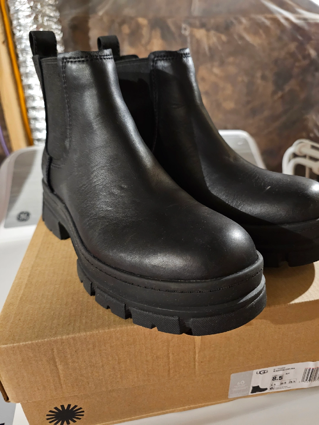 Selling a pair of Ugg Madisyn Chelsea boots in black. They are size 8.5 and in great condition as they've never been worn. These stylish boots are perfect for everyday wear and have a comfortable fit!