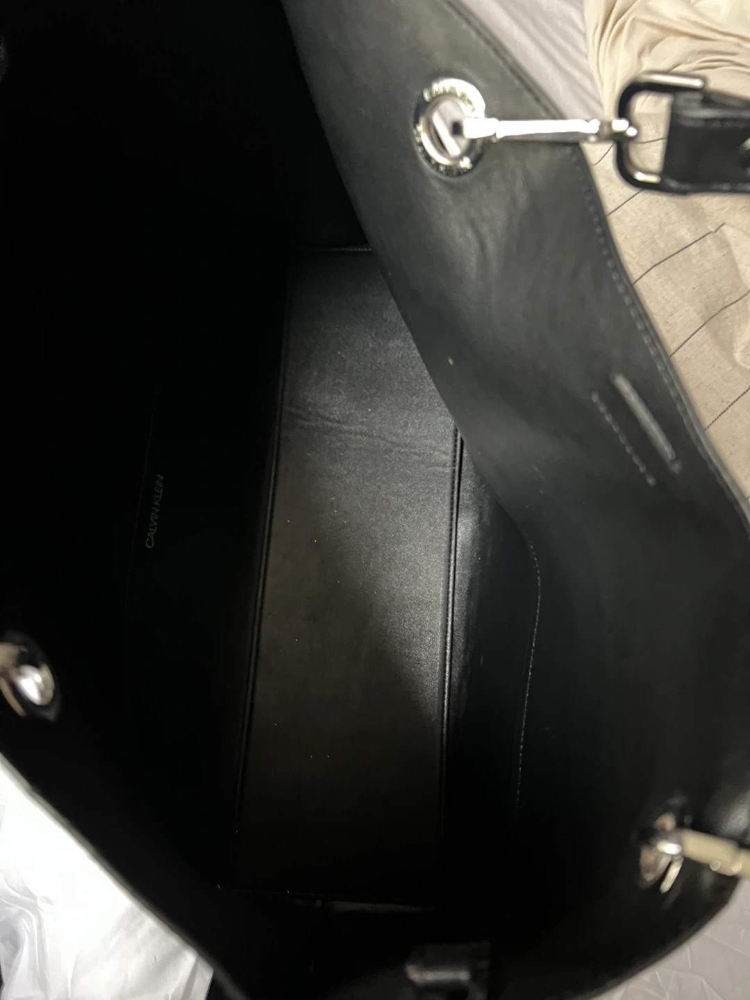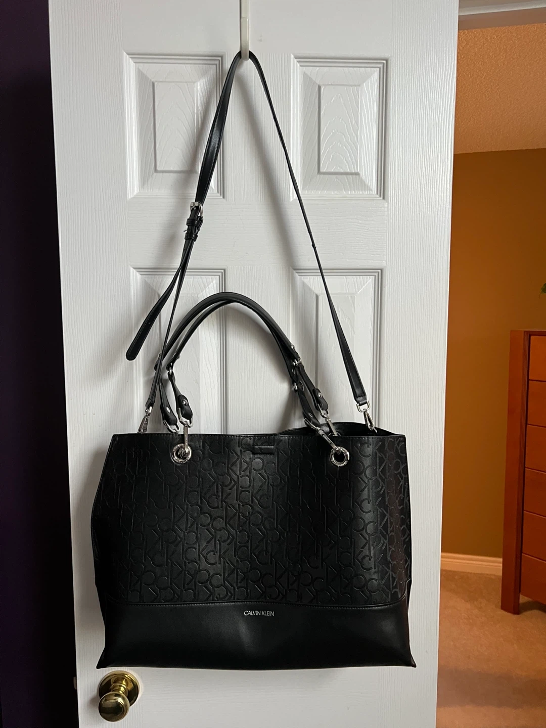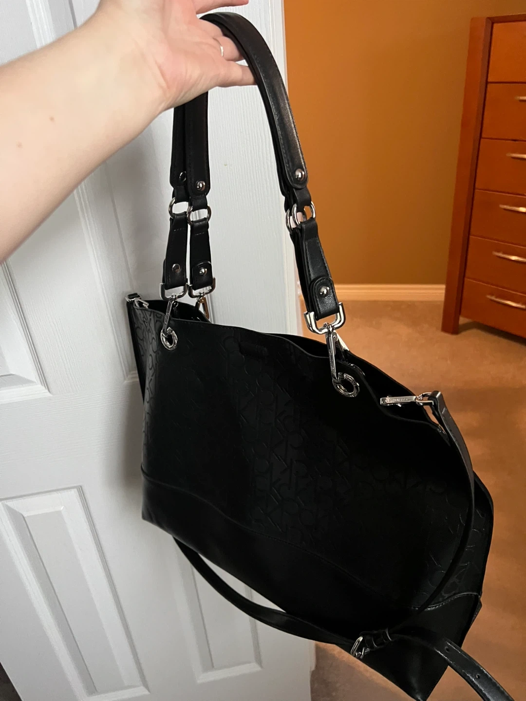 Selling a Calvin Klein tote bag in black! It's in great condition and has a stylish embossed logo pattern. Perfect for everyday use or as a chic accessor. Measurements- 19 inches wide and 13 inches tall