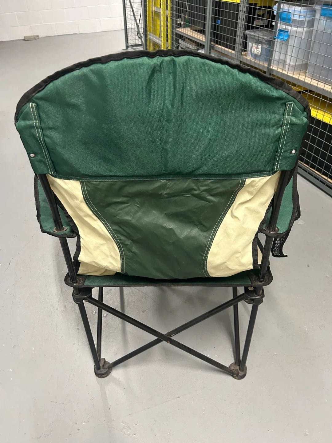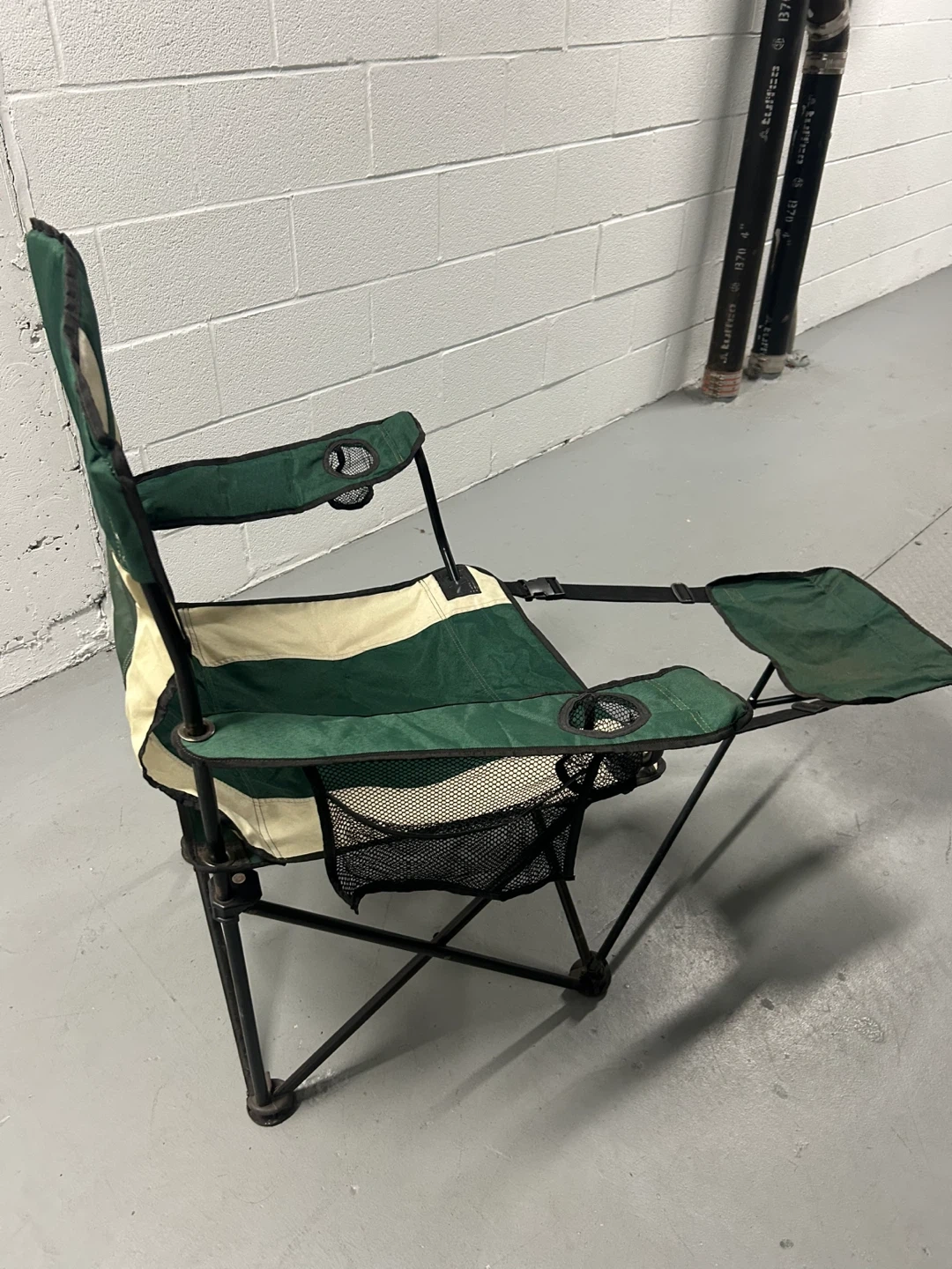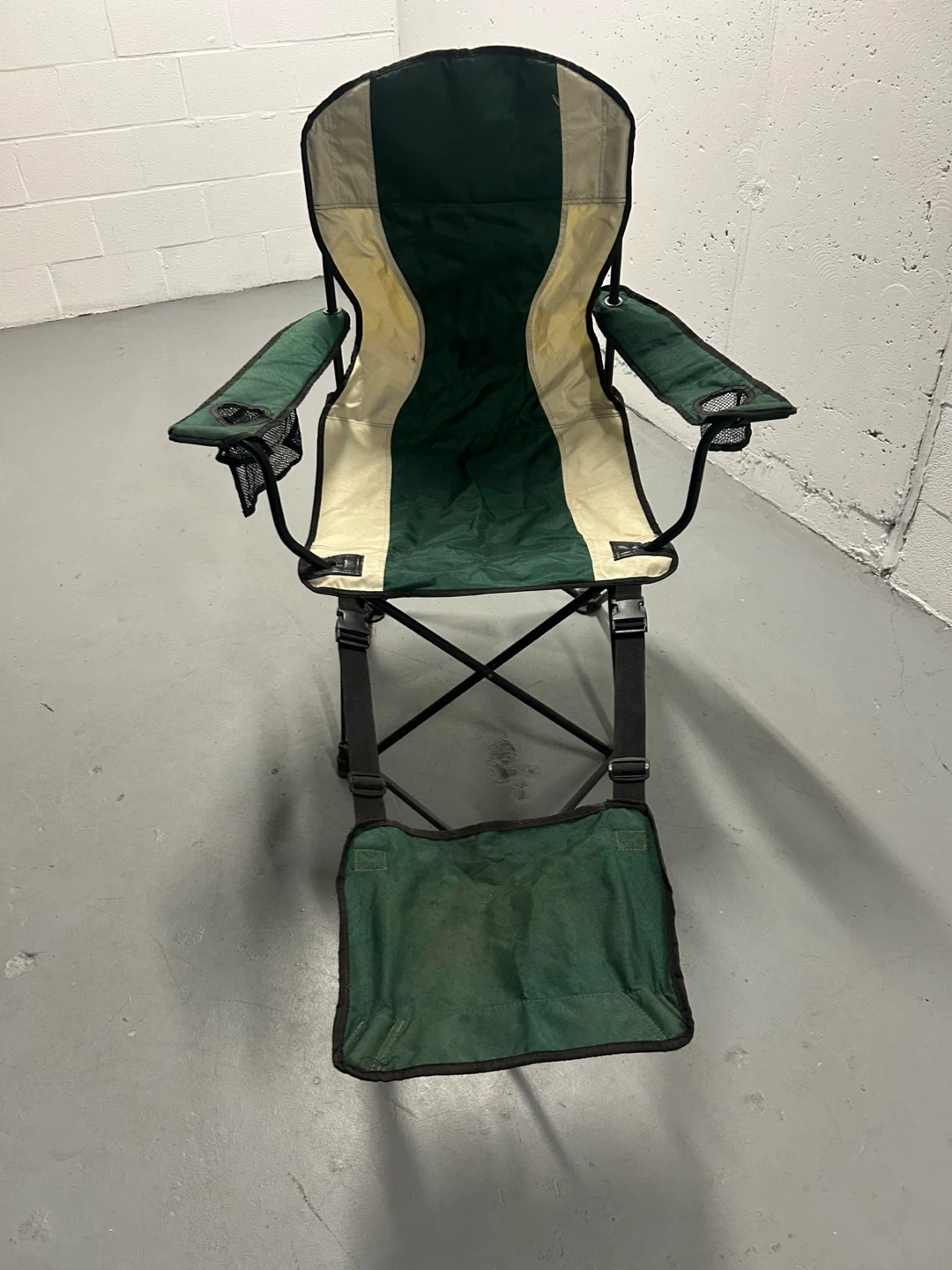 Selling a gently used folding camping chair! It's got a comfy footrest and convenient armrests with built-in cup holders. Perfect for camping, picnics, or just relaxing in the backyard. It's green and beige in colour and folds up easily for storage and transport