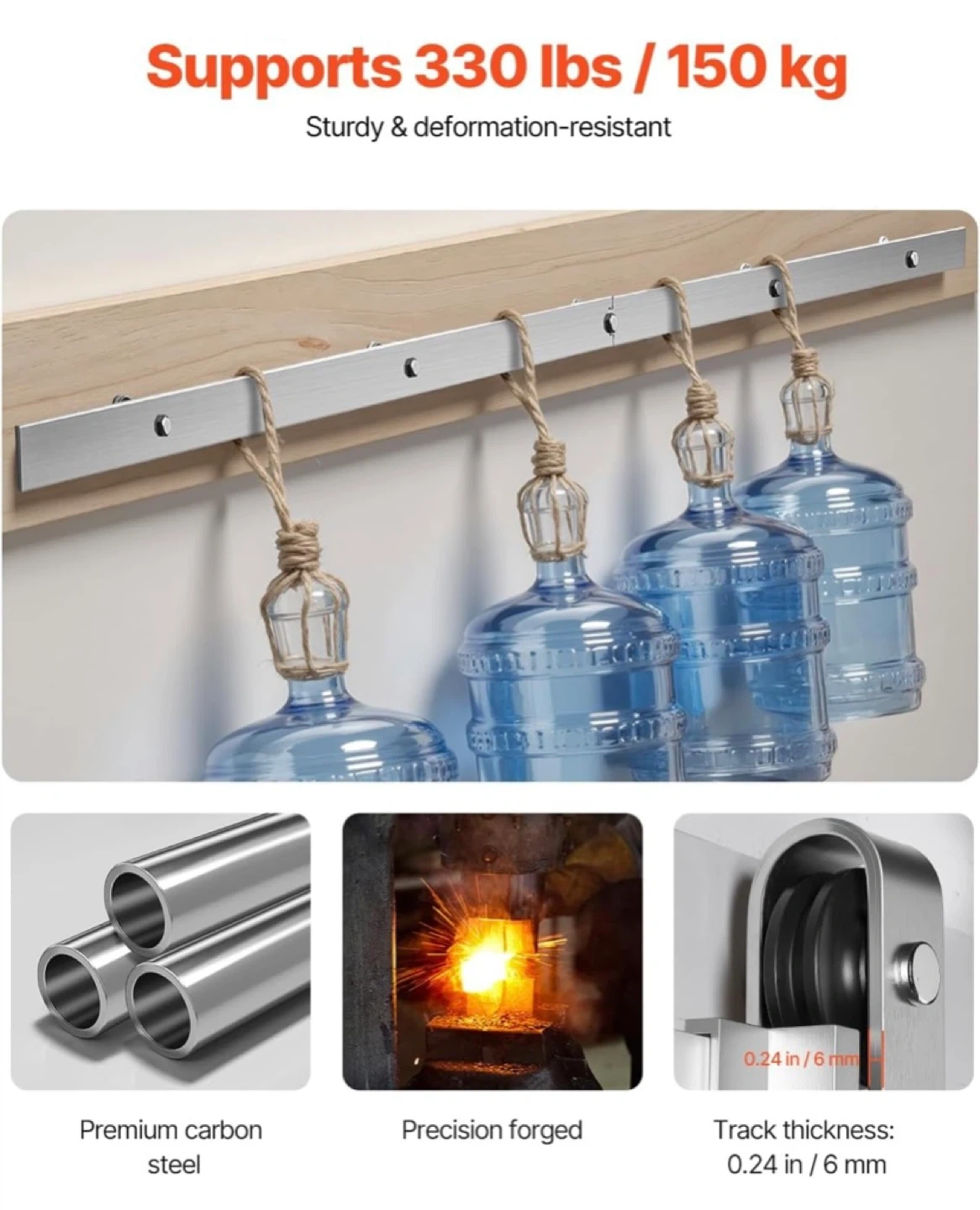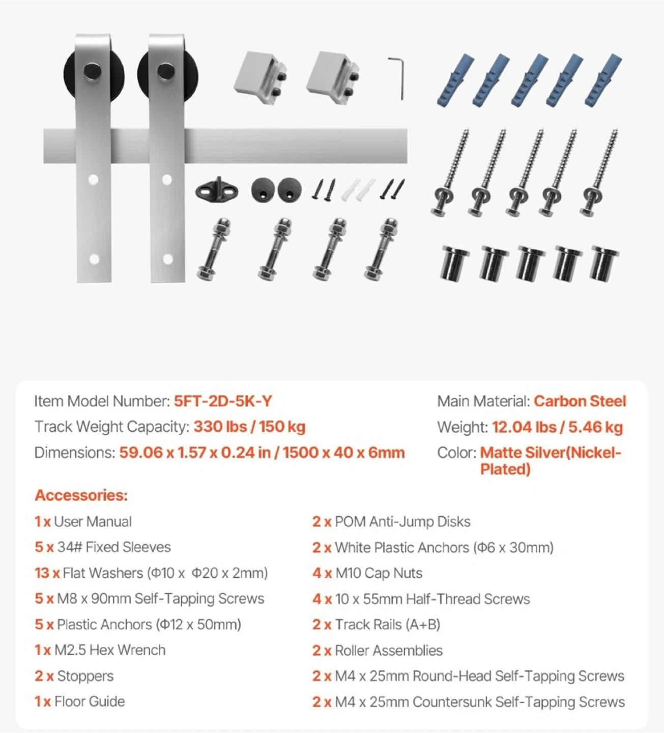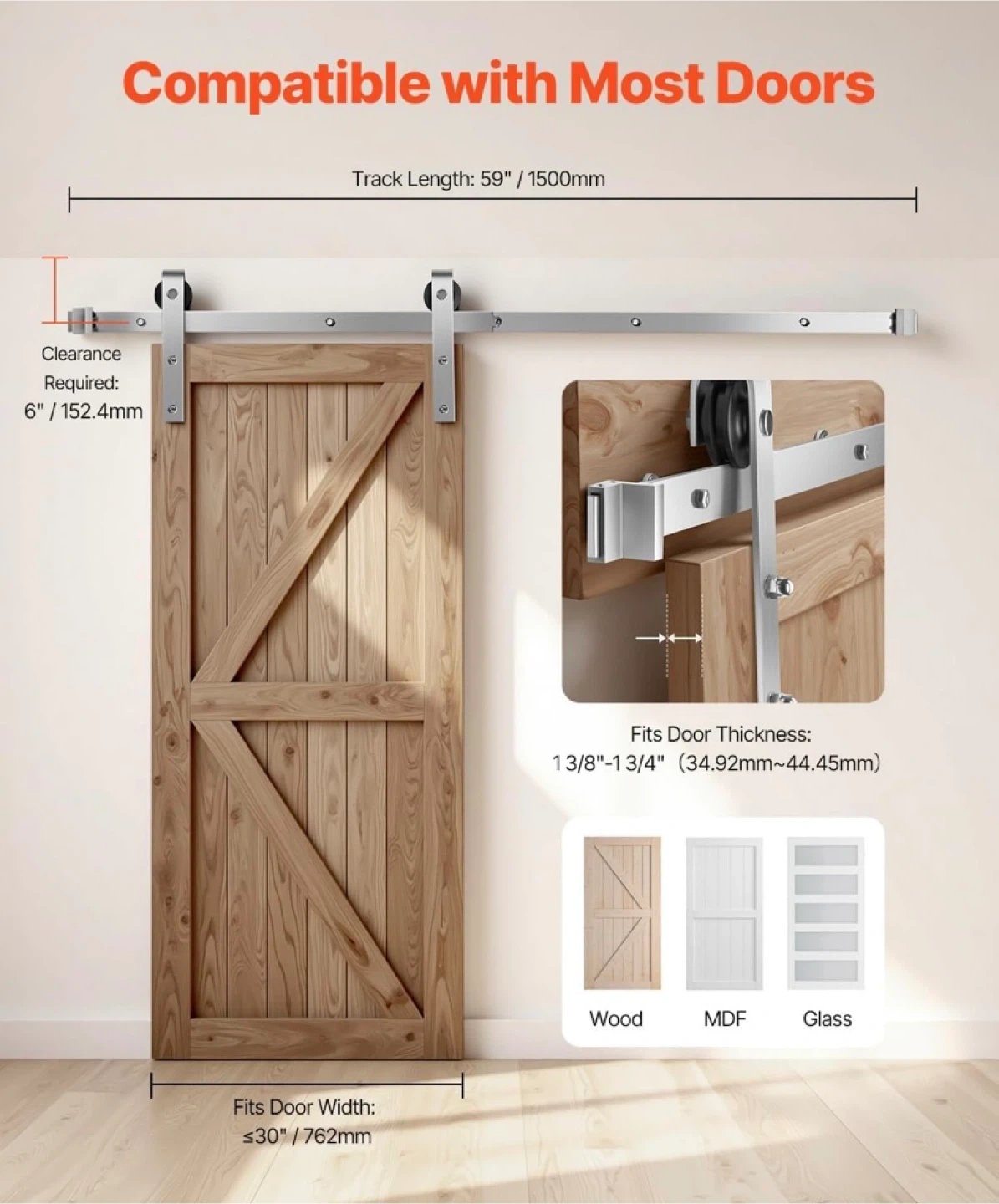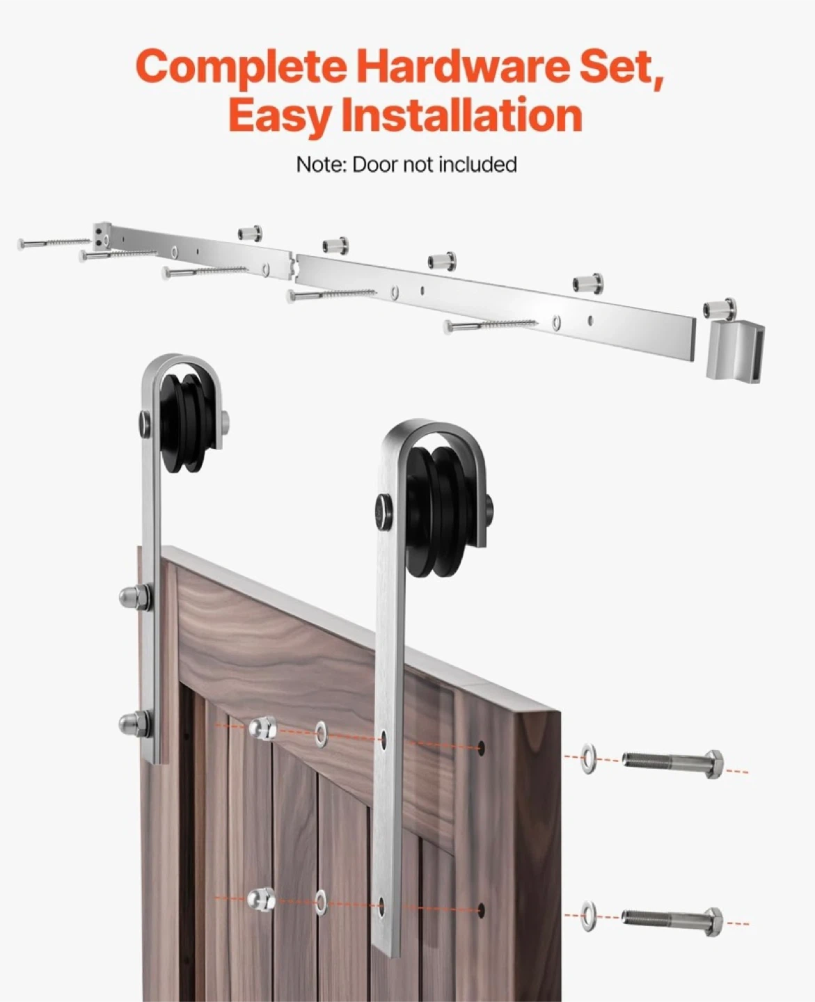 New VEVOR 5FT Sliding Barn Door Hardware Kit Brushed Nickel $45 Pickup in Whitby High-end Finish: Crafted from thick carbon steel with a brushed nickel finish, this barn door hardware kit combines elegance with strength, ensuring long-lasting beauty and durability. Smooth and Quiet: Equipped with high-density thermoplastic wheels and excellent bearings, the sliding barn door operates smoothly and quietly, ensuring no disruption to your peace. Easy to Install: Complete with all necessary accessories and a step-by-step graphic and text installation manual, you’ll have the barn door track up and running in no time. NOTE: Door not included. Fit Most Doors: Our sliding door hardware kit is compatible with doors that are 1-3/8 to 1-3/4 inches thick (34.92 mm ~ 44.45 mm), and up to 30-inch / 762 mm wide. Ideal for wood, glass, and MDF barn doors