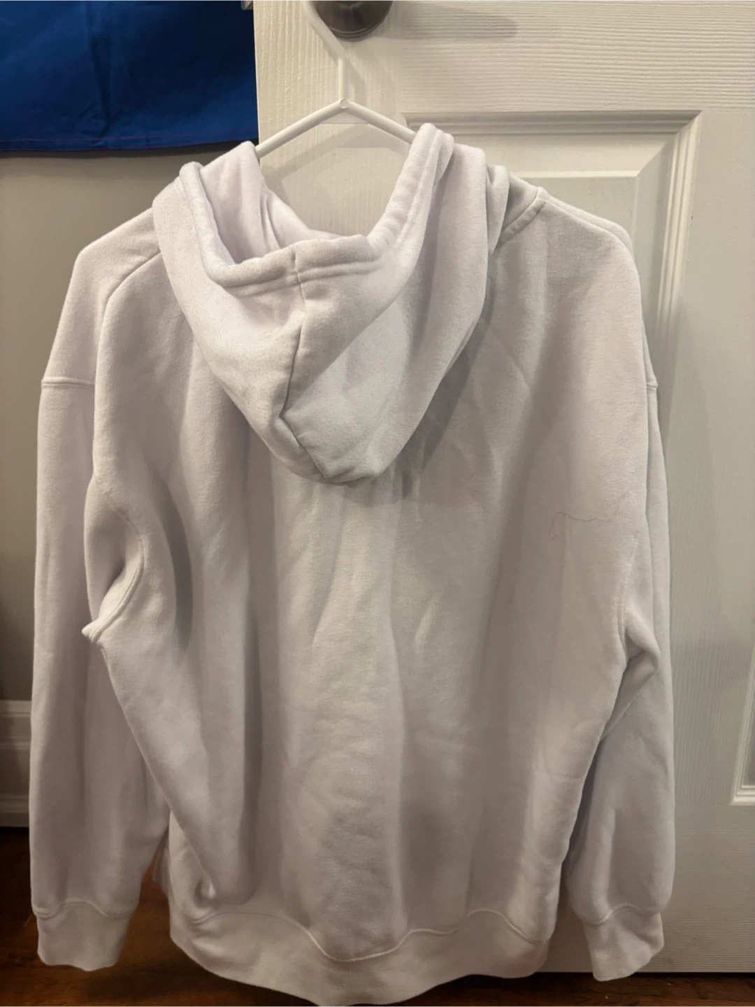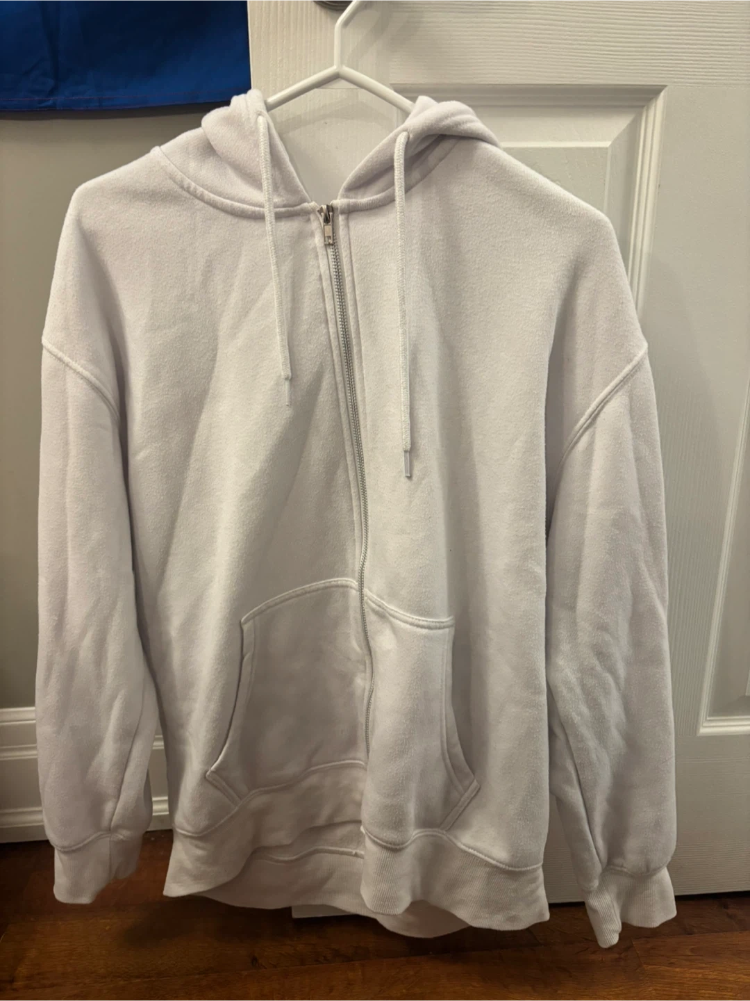 Selling a white zip-up hoodie! It's in great condition and perfect for layering. It has a classic design with a front pocket and a comfortable fit. This hoodie is a versatile addition to any wardrobe!