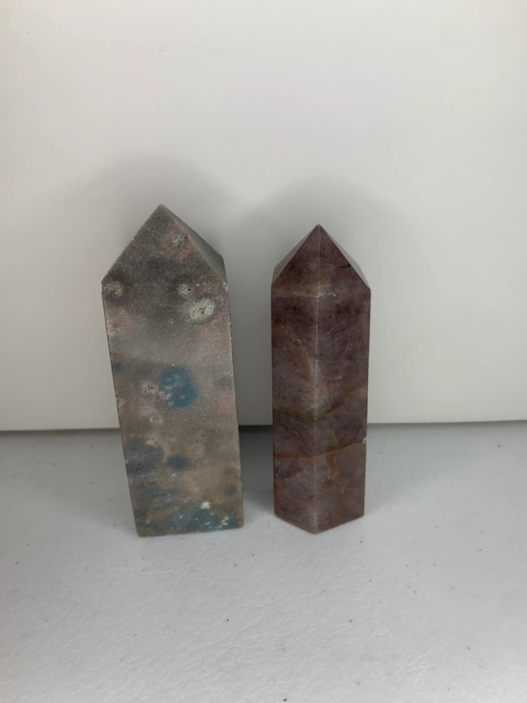 Selling two crystal tower points. Great for home decor or spiritual practices! One is a mottled grey and blue, the other is a reddish-brown colour. They are in good condition