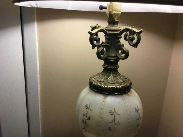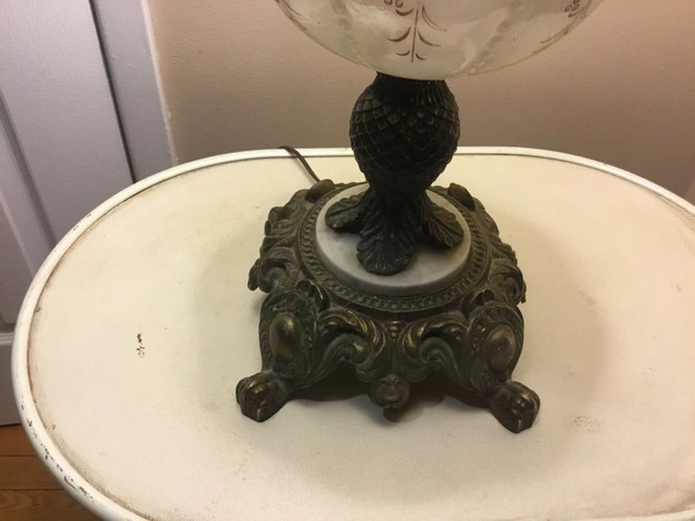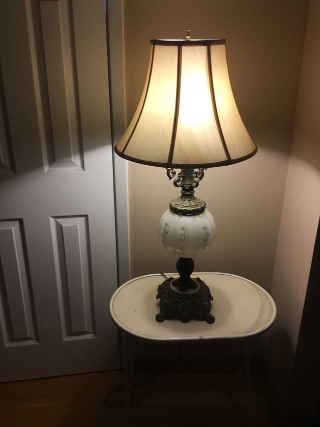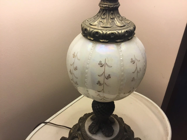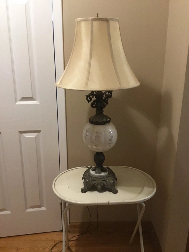 Vintage metal (non magnetic) table lamp with decorative glass ball in excellent condition. Measures 35” tall. Pickup in the Cawthra and Rathburn area in Mississauga.