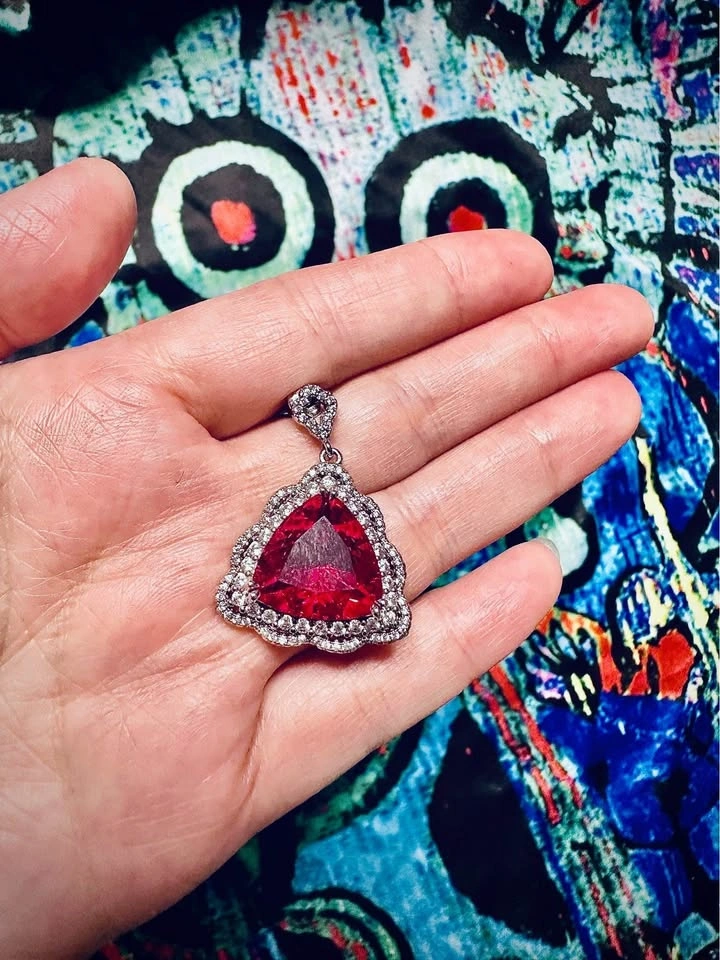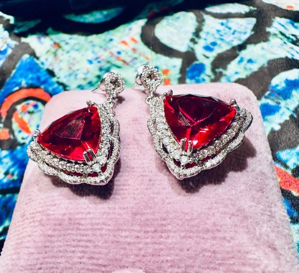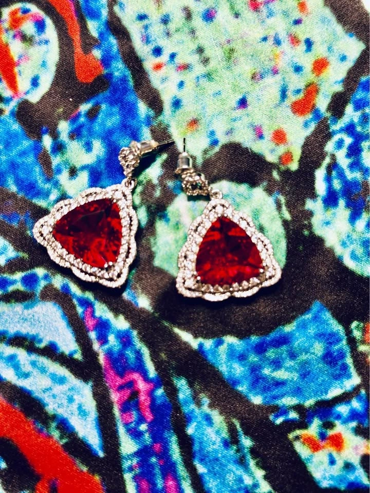 Add a bold touch of elegance to your style with these gorgeous ruby-colored crystal earrings, featuring radiant trillion-cut red crystal stone surrounded by shimmering white crystal stones. Crafted to perfection, these earrings aren’t just beautiful—they’re also believed to carry powerful energy for emotional and spiritual healing. Key Features: • Brilliant ruby-colored stones – vivid, fiery red with incredible clarity • Trillion-cut design – unique and eye-catching • Surrounded by sparkling white accents for added brilliance • Set in a high-quality metal mount, perfect for sensitive skin • Includes velvet jewelry box – ideal for gifting or safekeeping Crystal Energy & Healing Benefits: Rubies are traditionally known as the “Stone of Passion and Vitality.” They are believed to: • Boost confidence and motivation • Stimulate the heart chakra and attract love • Encourage courage, strength, and emotional resilience • Energize the body and clear emotional blockages Whether you’re a spiritual crystal enthusiast, a gemstone collector, or just someone who appreciates meaningful beauty—these earrings are for you. Available for local pickup. Message for pricing and availability – only one pair available!