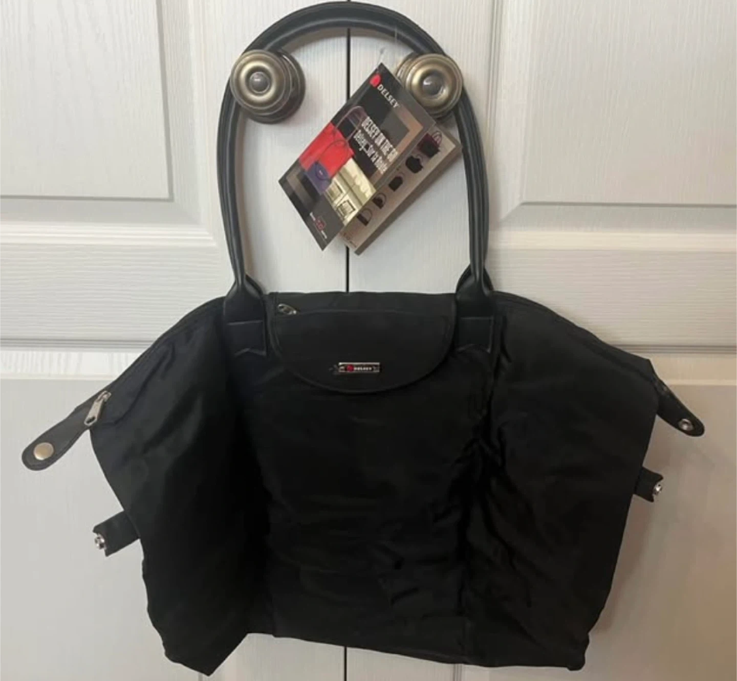 Brand New Delsey On The Go bag. It's made of microballistic nylon and can fold to 1/8 their size to allow better storage when not in use. It's simply fold and go! Measurements are 23 inches x 17 inches when fully opened.