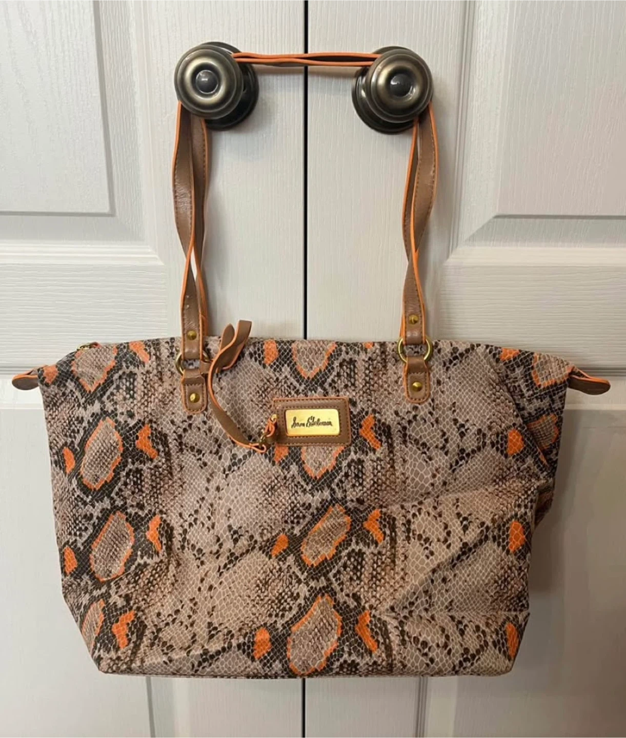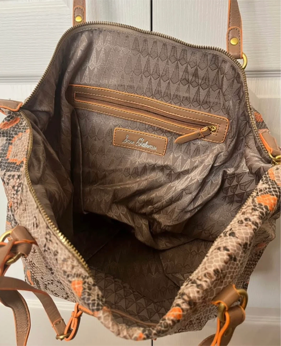 Stylish Sam Edelman tote bag with a unique snakeskin pattern! This bag is in great condition and perfect for everyday use. It features brown leather straps and trim with orange accents. The interior has a brown patterned lining and a zippered pocket. Measurements are 18 inches x 11 inches x 7 inches. A fashionable and functional addition to your wardrobe!
