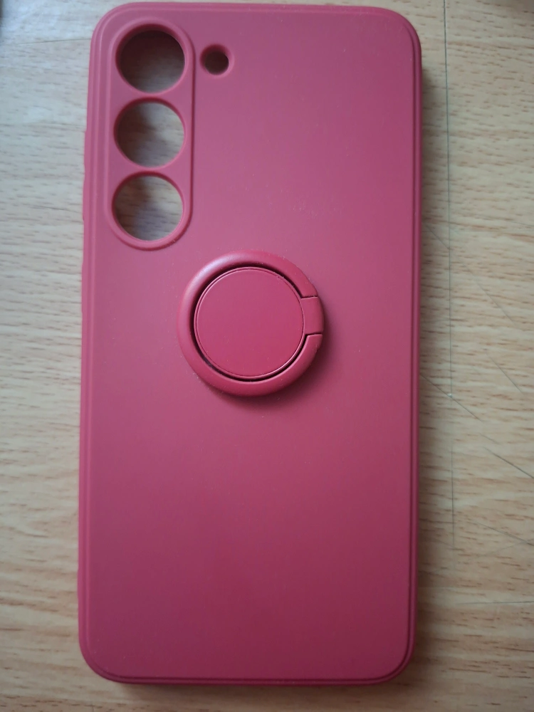 Selling a rose red phone case for a Samsung S23. It has a ring on the back for easy holding and a soft interior to protect your phone. It's in great condition! soft silicone