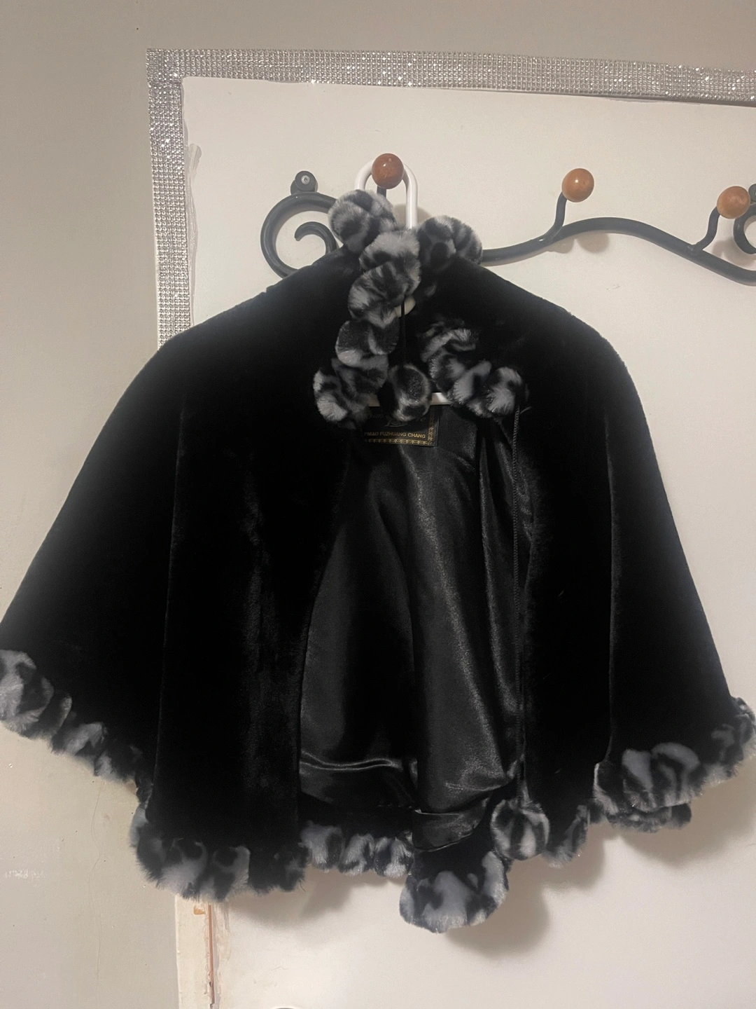 Check out this stylish black faux fur cape from San He! It's in great condition and perfect for adding a touch of elegance to any outfit. The faux fur trim adds a fun and unique detail