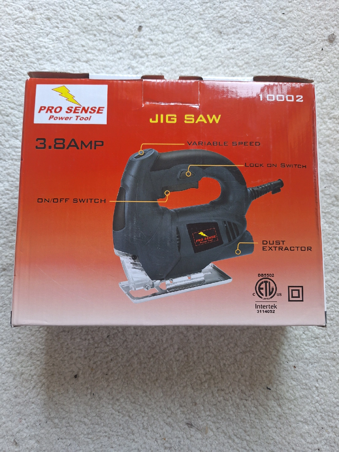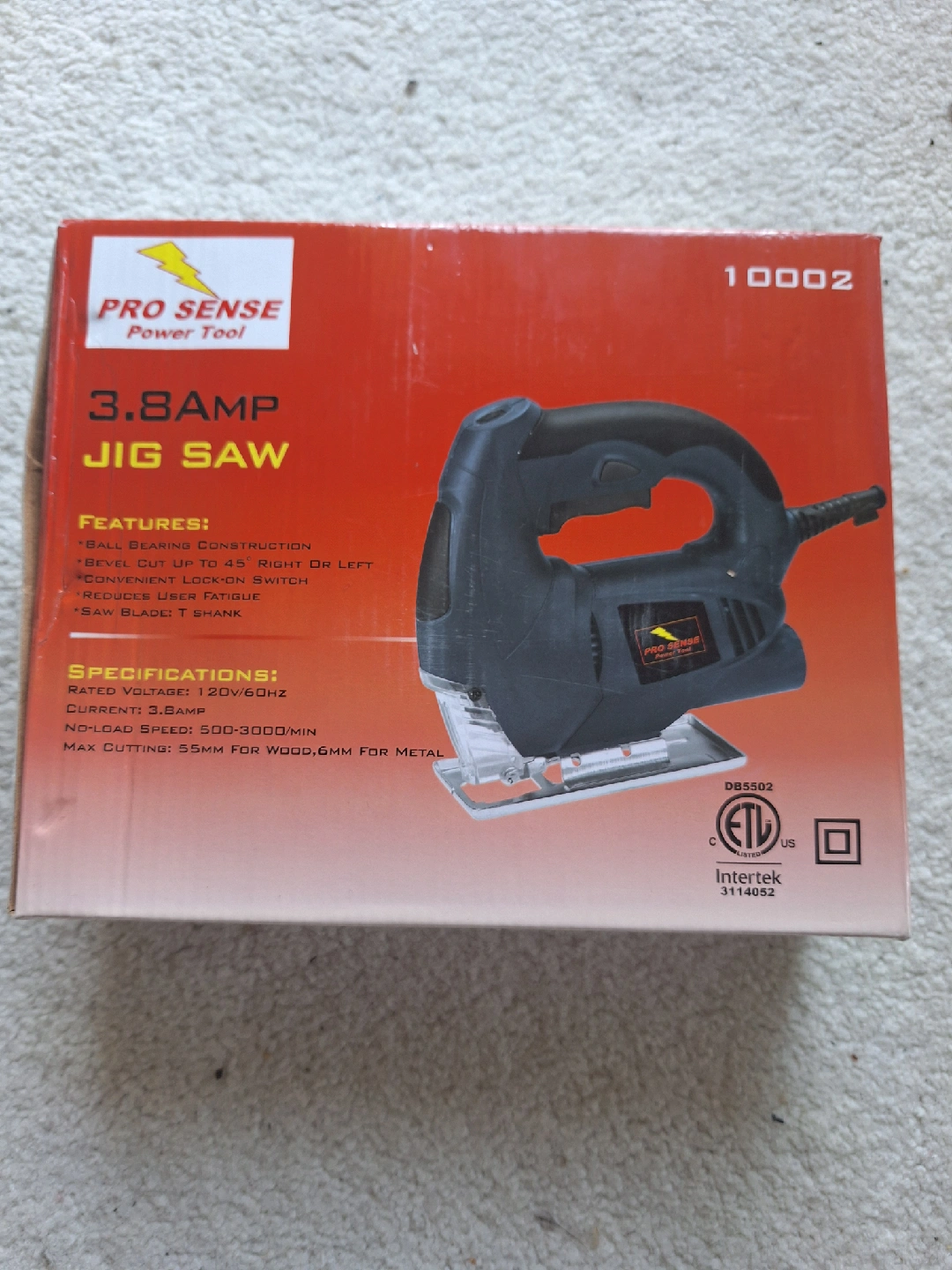 Selling a brand new Pro Sense 3.8 AMP Jig Saw! It's still in its original box and includes all components. Features: - Ball bearing construction - Bevel cut up to 45° right or left - Convenient lock-on switch - Reduces user fatigue - Saw blade: T shank Specifications: - Rated Voltage: 120V/60Hz - Current: 3.8AMP - No-load speed: 500-3000/min - Max cutting: 55mm for wood, 6mm for metal