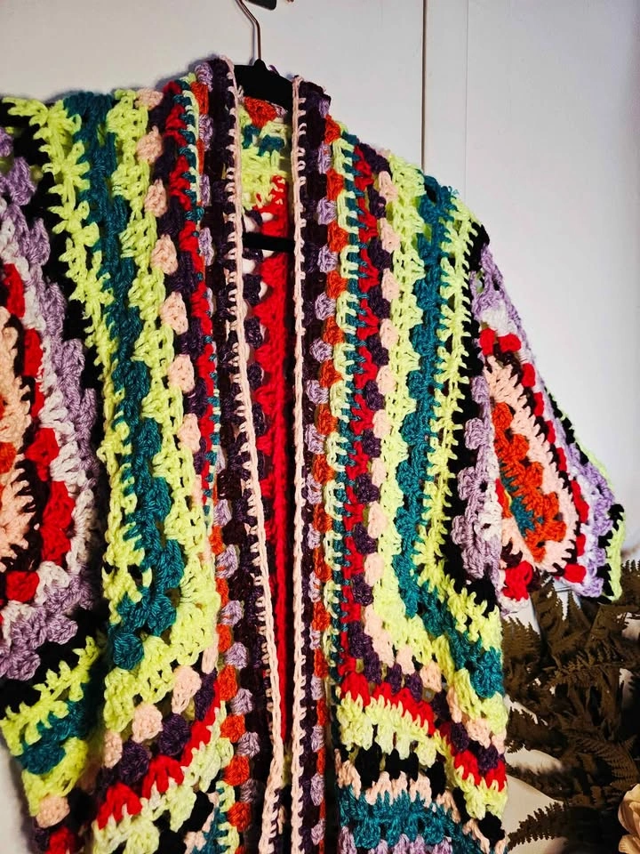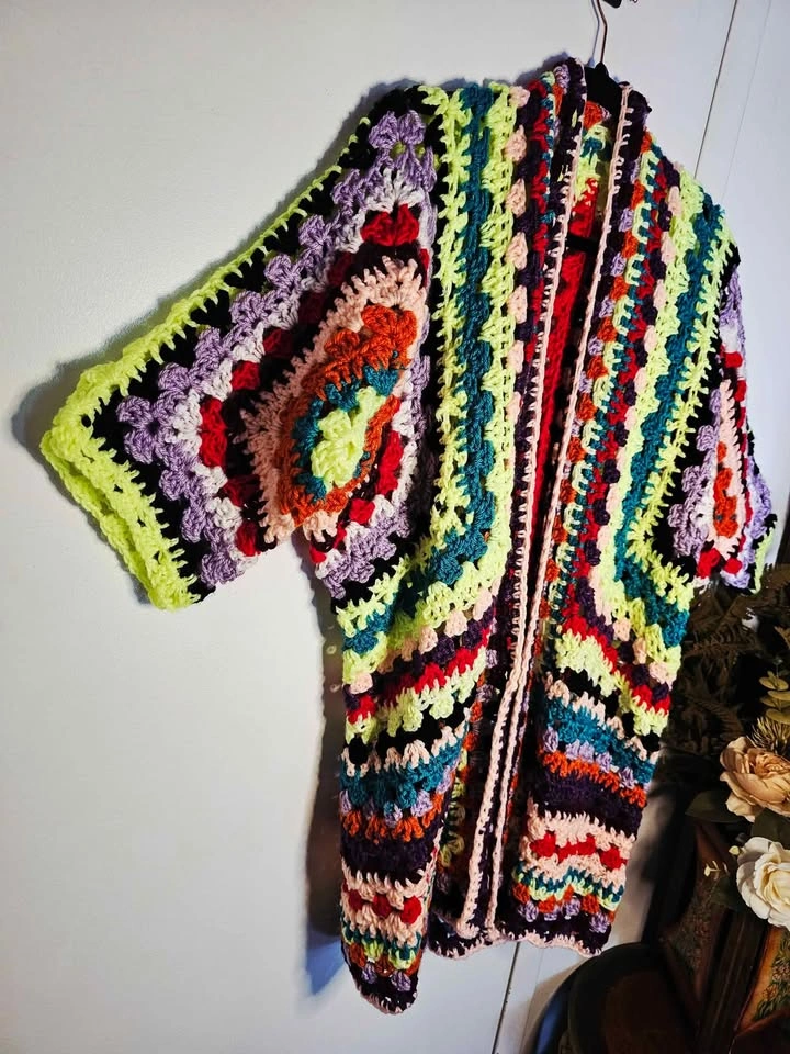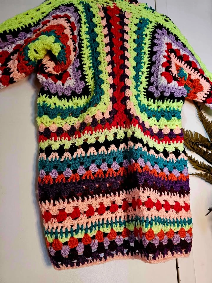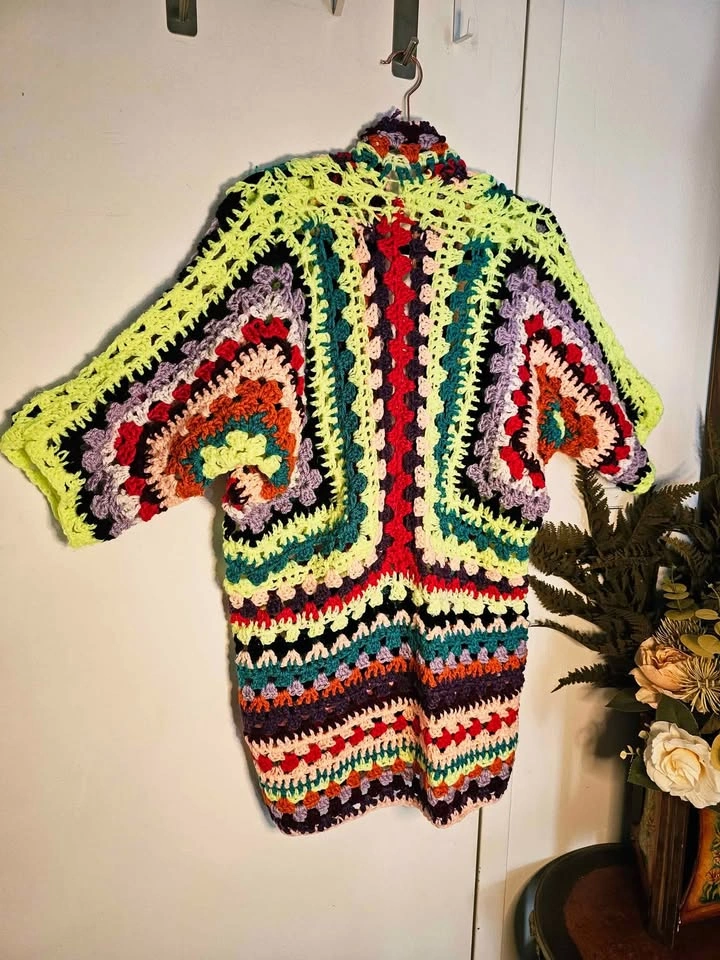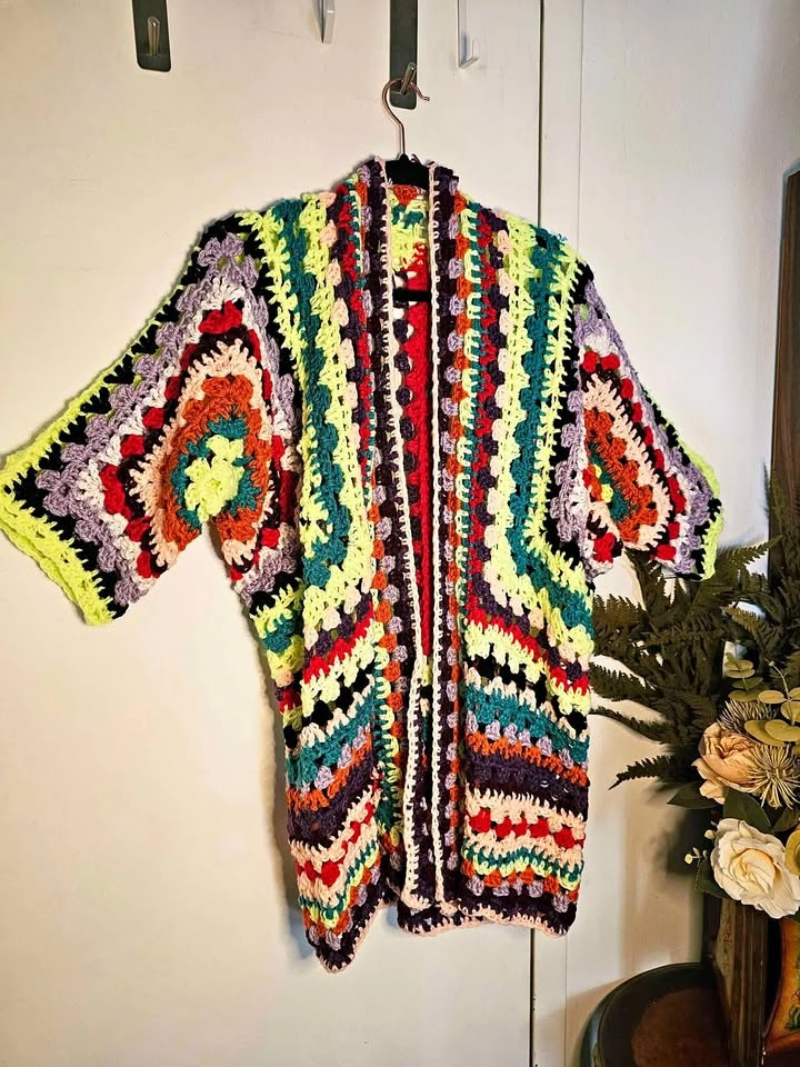 Vibrant and truly one of a kind handmade maximalist crochet hex square cardigan! Cardigan is brand new and has never been worn. It is a longer length (about mid-thigh or just under the bum if you're tall) and has elbow length sleeves. It is made in cheery shades of neon yellow-green, forest green, plum purple, lilac purple, light pink, red, grey, terracotta orange, and white. Made of acrylic yarn. Cardigan is free size and will fit anywhere from a Small to an XL, depending on how oversized you'd like it to be. Pit to pit measures about 25", and shoulder to bottom hem measures about 31.5". whimsical goblincore grunge alternative multicolor grandmacore bohemian boho hippie festival rave raver dopamine hexagon colorful