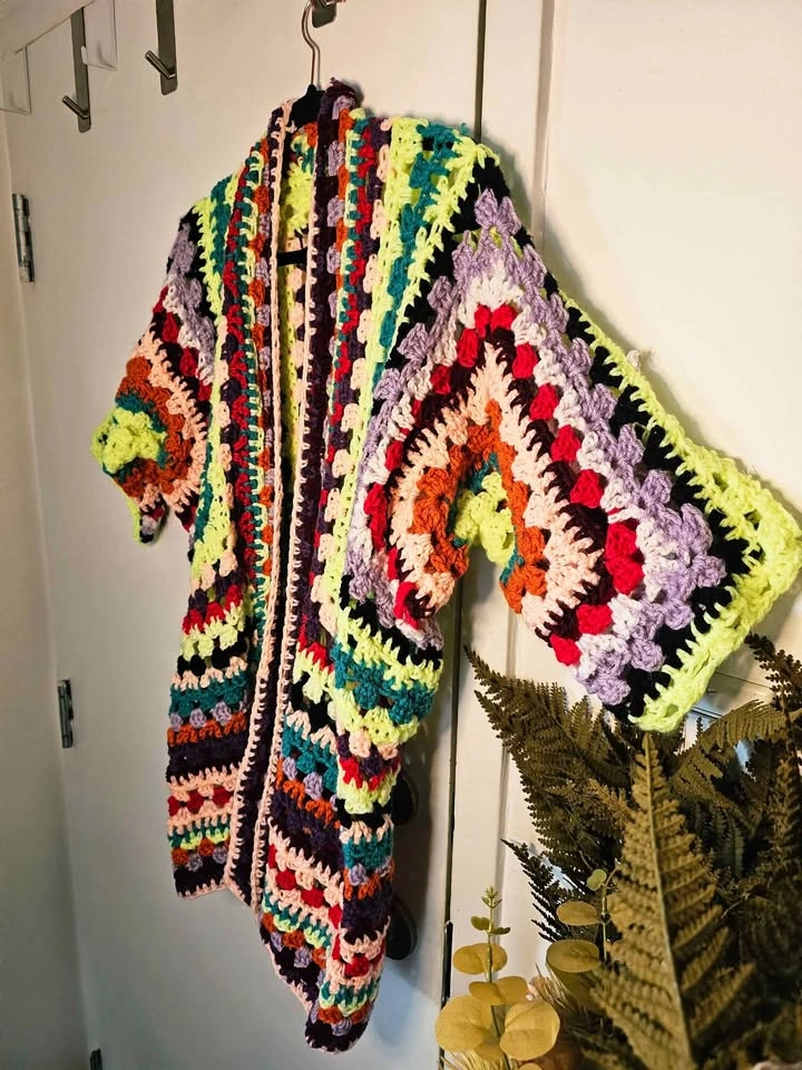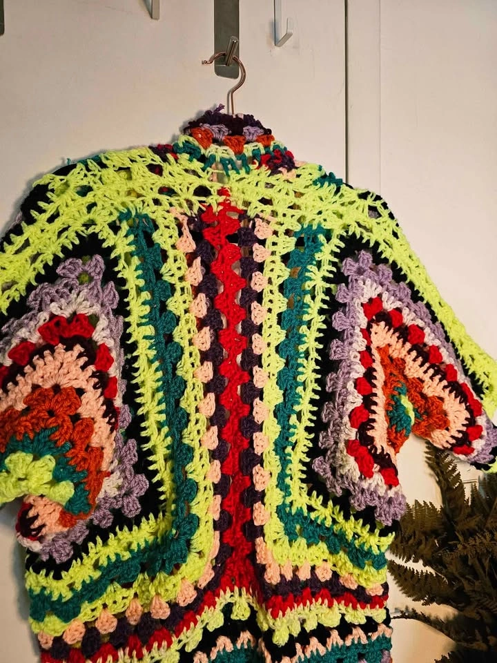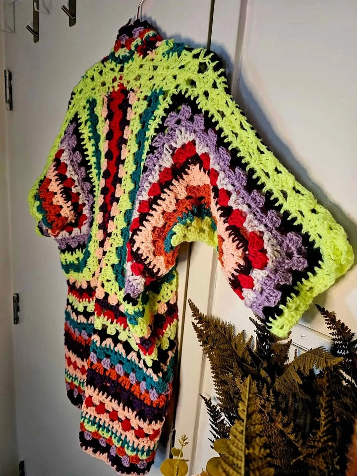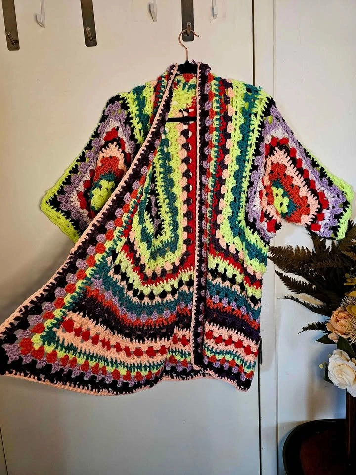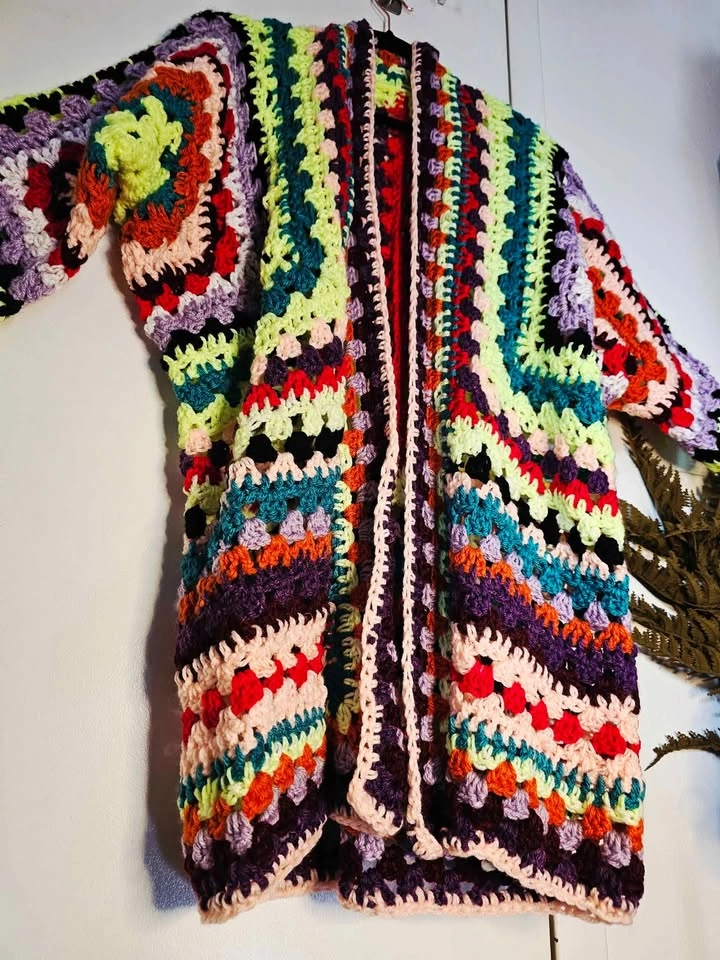 Vibrant and truly one of a kind handmade maximalist crochet hex square cardigan! Cardigan is brand new and has never been worn. It is a longer length (about mid-thigh or just under the bum if you're tall) and has elbow length sleeves. It is made in cheery shades of neon yellow-green, forest green, plum purple, lilac purple, light pink, red, grey, terracotta orange, and white. Made of acrylic yarn. Cardigan is free size and will fit anywhere from a Small to an XL, depending on how oversized you'd like it to be. Pit to pit measures about 25", and shoulder to bottom hem measures about 31.5". whimsical goblincore grunge alternative multicolor grandmacore bohemian boho hippie festival rave raver dopamine hexagon colorful