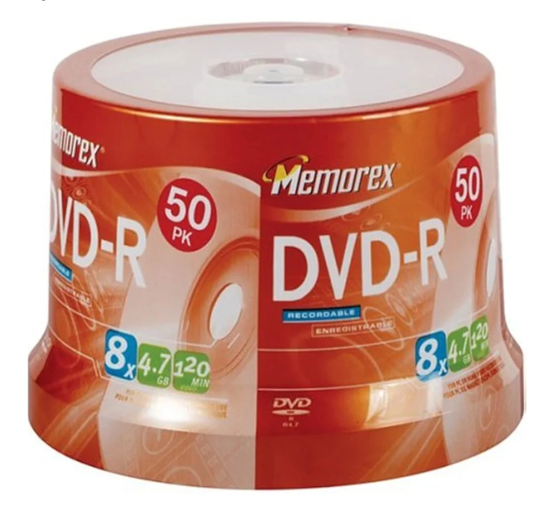 Selling a spindle of Memorex DVD-R discs. It contains 50 recordable DVDs, each with 4.7 GB capacity and 120 minutes recording time
