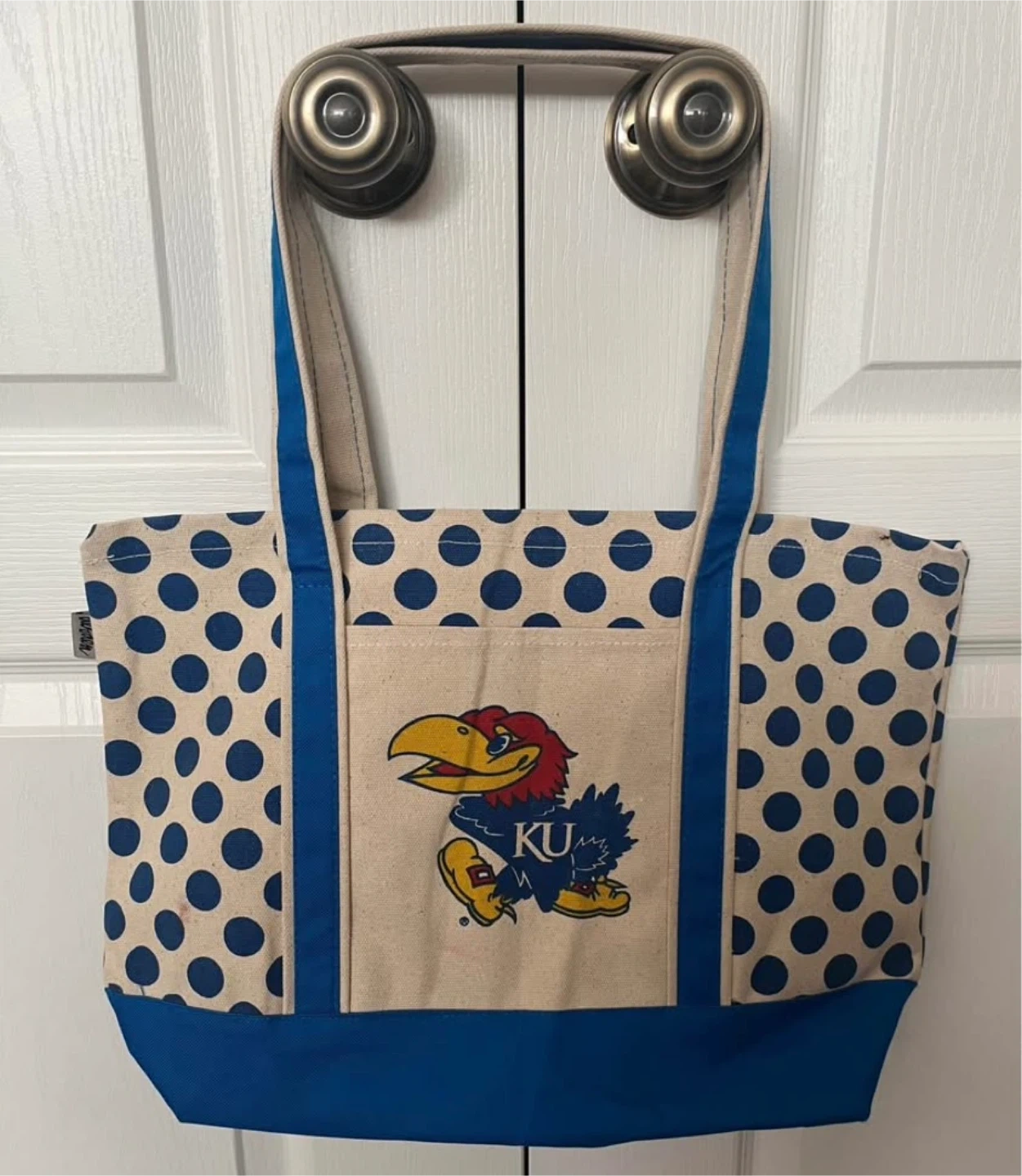 This is a Desden tote bag featuring the Kansas Jayhawks logo with a polka dot pattern! It's in great shape. Measurements are 17 inches x 12 inches x 4 inches.