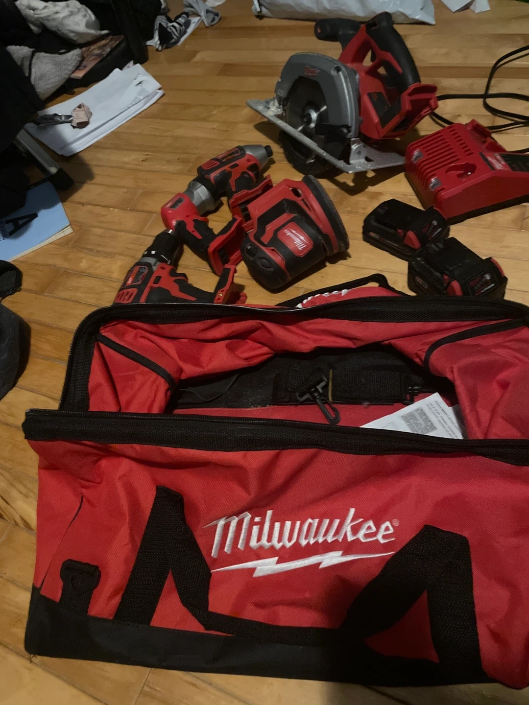 Selling a Milwaukee power tool set, including a drill, impact driver, sander, circular saw, batteries, and charger. All in good working condition and ready for your next project. Comes with a Milwaukee tool bag for easy storage and transport. Perfect for DIY enthusiasts or professionals