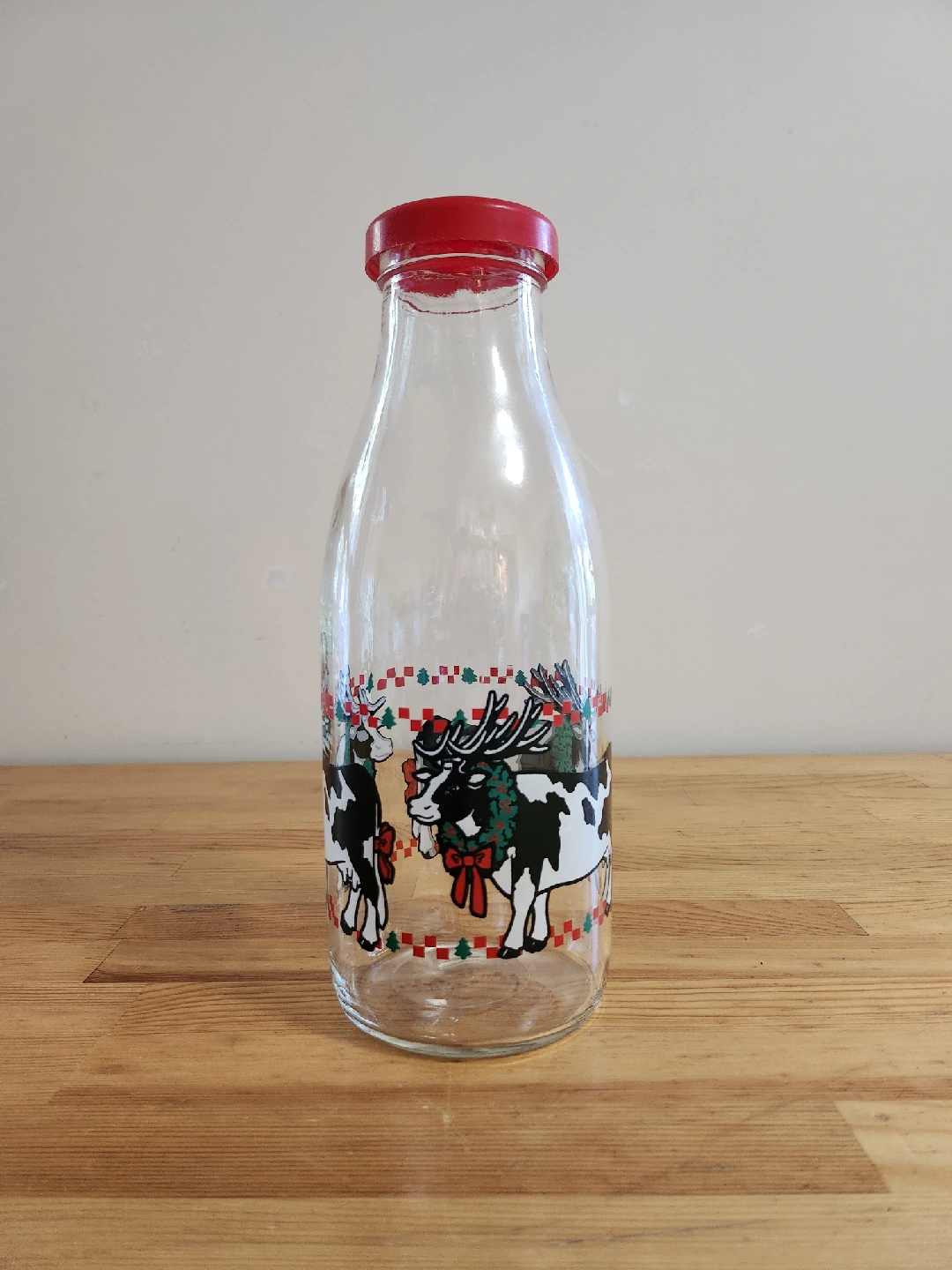 Selling a charming vintage milk bottle! It features a delightful Christmas cow design, perfect for adding a touch of nostalgia to your holiday decor. The bottle is clear glass with a red lid. It's in great condition and ready to bring some festive cheer to your home.