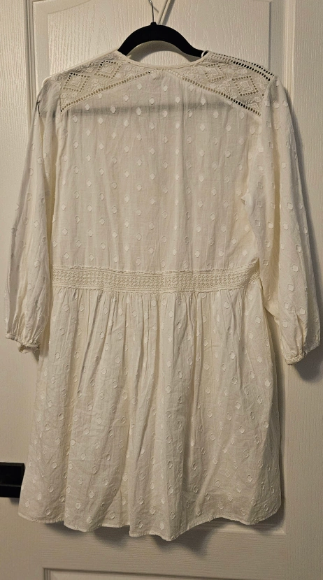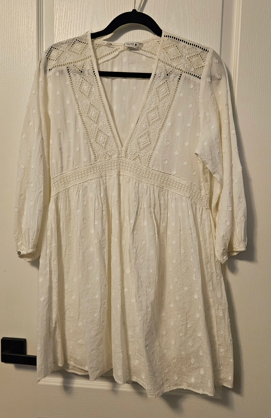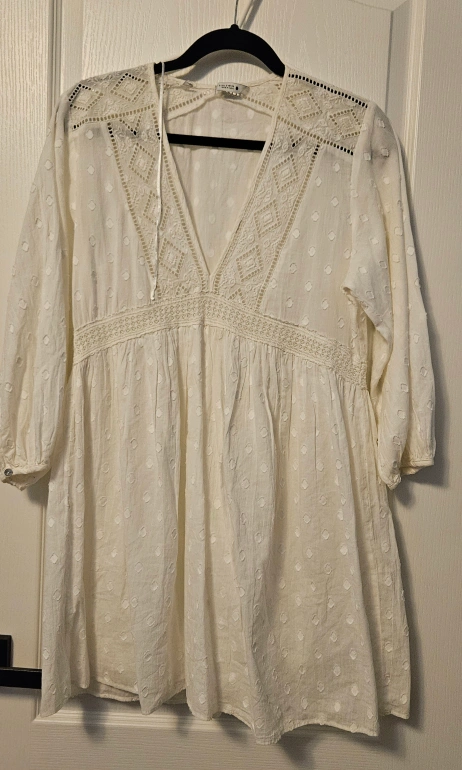 Selling a cute Zara dress. It's a lovely off-white colour with delicate embroidery details. Perfect for a casual day out or dressed up for an evening. Bought but never worn.