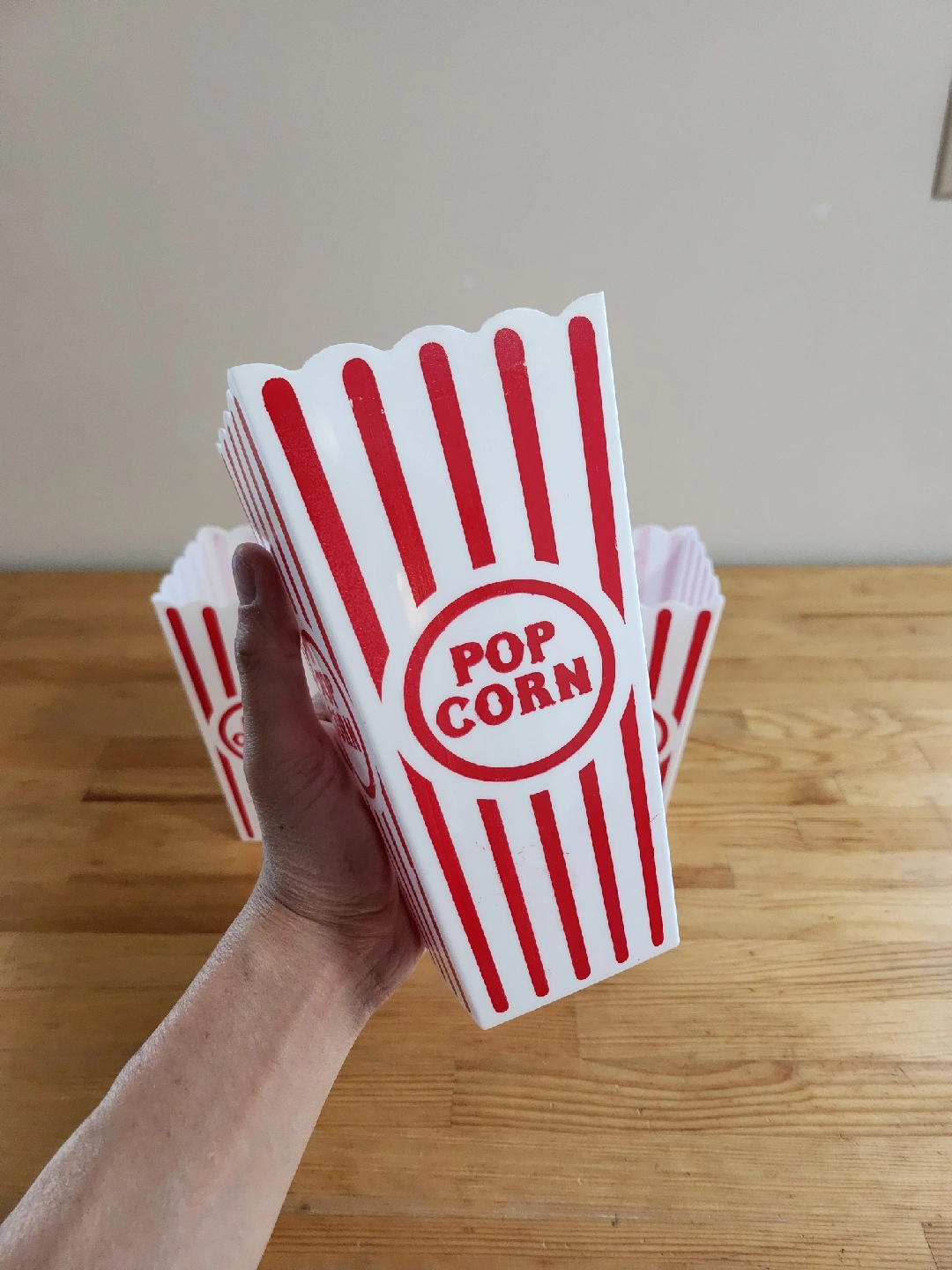 A set of 4 popcorn containers! These are perfect for movie nights at home or for parties. Each container has the classic red and white striped design with the word 'POP CORN' in a red circle. They're in great condition and ready to hold your favourite snacks!