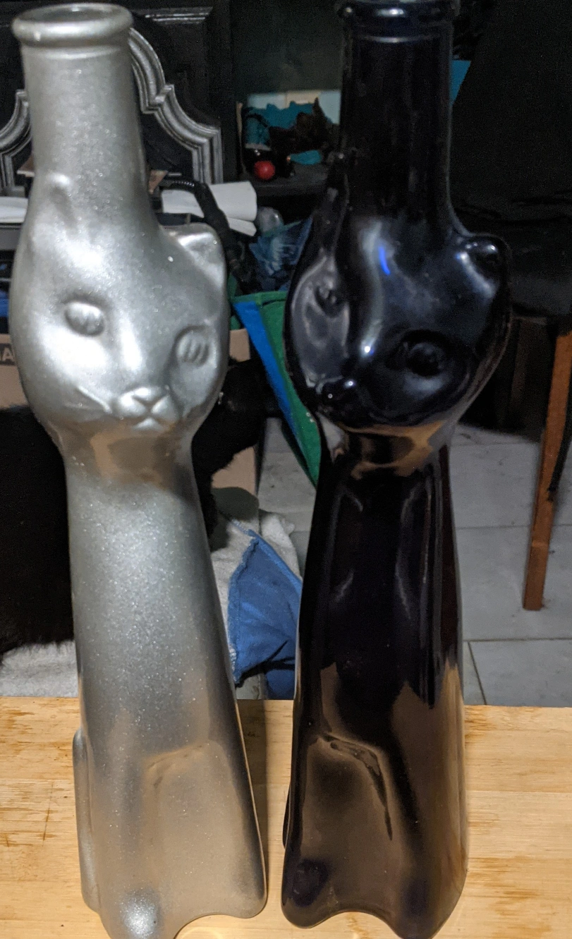 Selling a set of two cat-shaped bottle vases! One is silver and the other is dark blue They're perfect for adding a touch of feline charm to your home decor