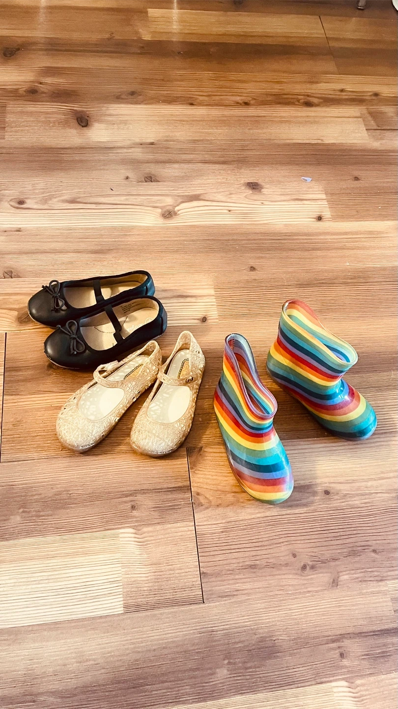 Selling a collection of girls' shoes in size 10! There's a pair of black ballet flats with a strap and bow, a pair of summer gold glittery shoes , and a pair of colorful striped rain boots. All are in good condition. Pick up in New Westminster $6 dollar each or 3 for $12
