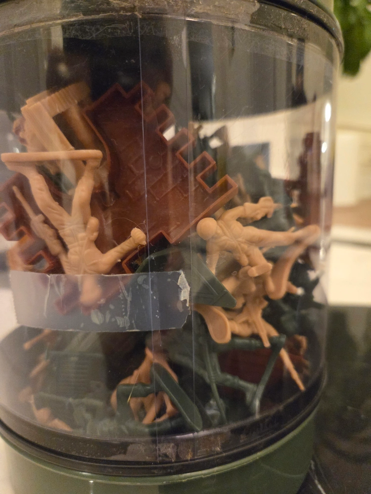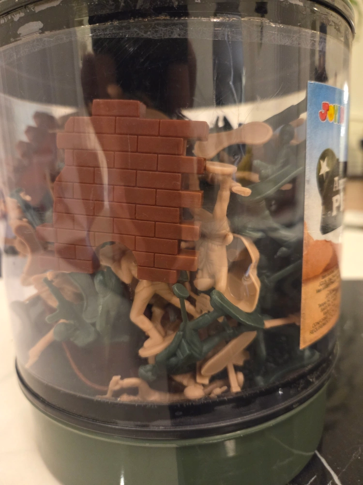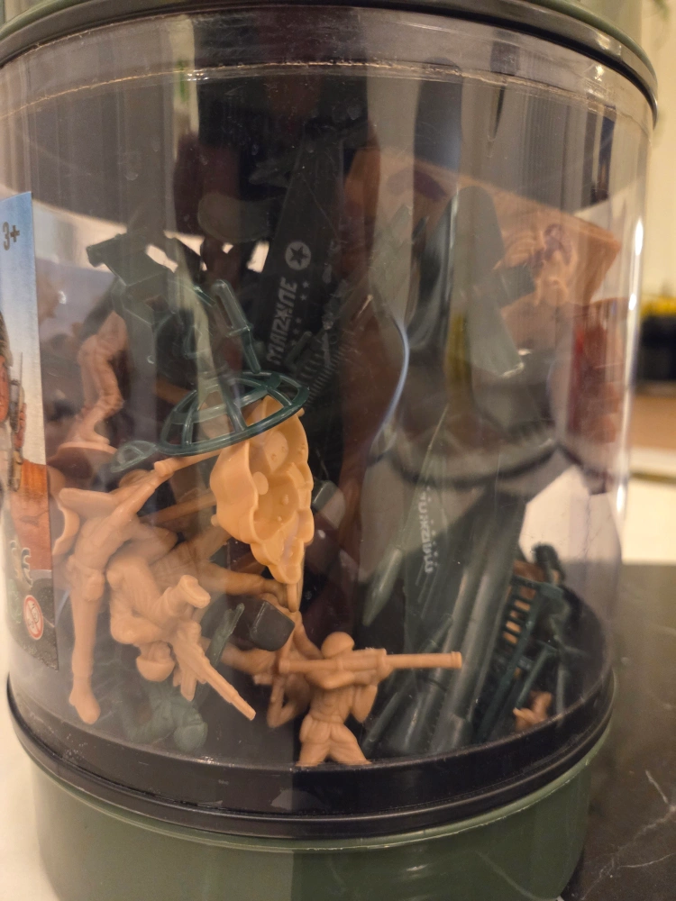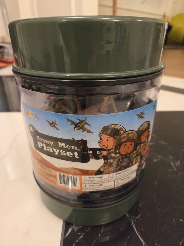 Jomami Army Men Playset! It includes a variety of army men, vehicles, and accessories for imaginative play. The set comes in a container for easy storage and transport. Hours of fun!