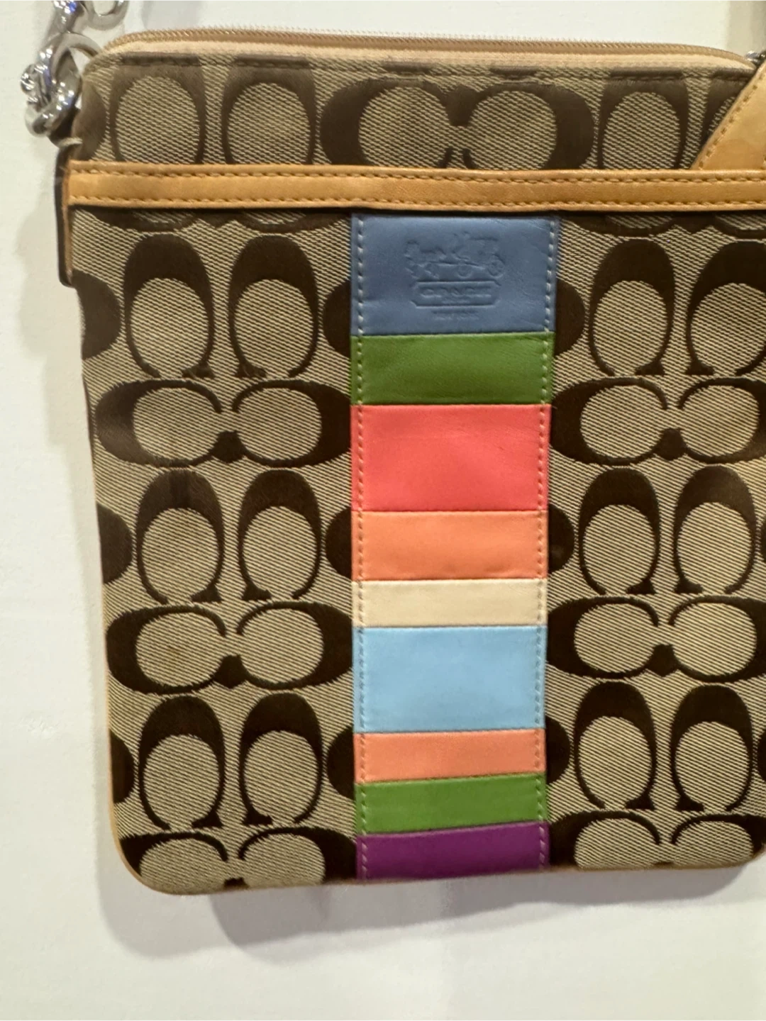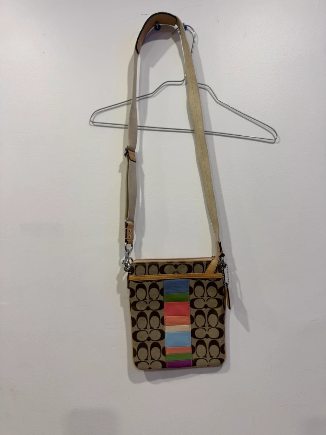 Selling a cute Coach crossbody bag! It features the classic Coach pattern with a fun, colourful stripe down the middle. Perfect for carrying your essentials on the go