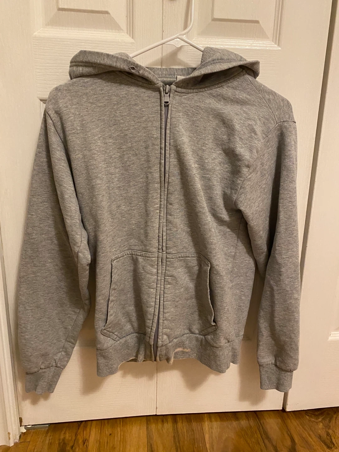 This is a Sunday Best grey, full-zip hoodie in size 2XS, perfect for layering or lounging, but please note it's in fair condition. There are some discolourations near the bottom of the zipper; please review the images.