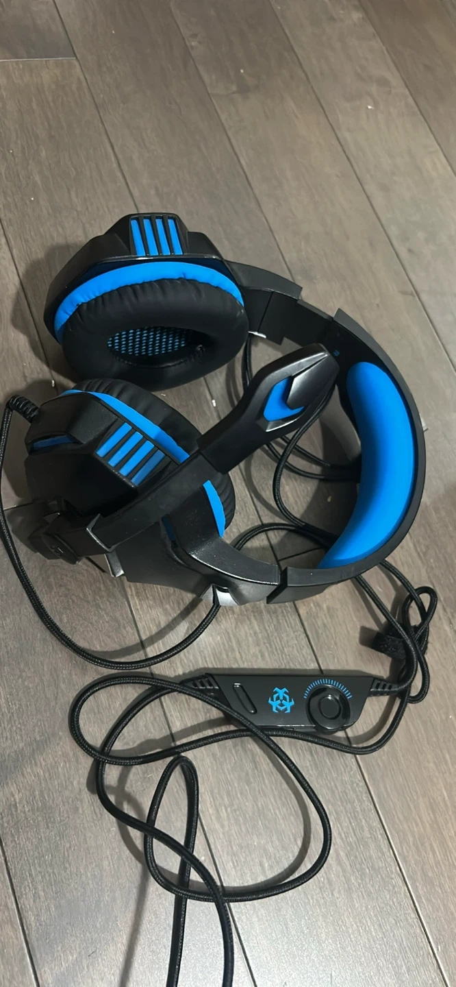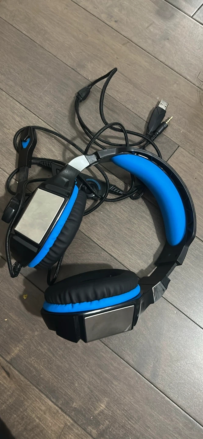 Selling a used gaming headset in black and blue. It's in good condition and ready for a new home. Perfect for gaming!