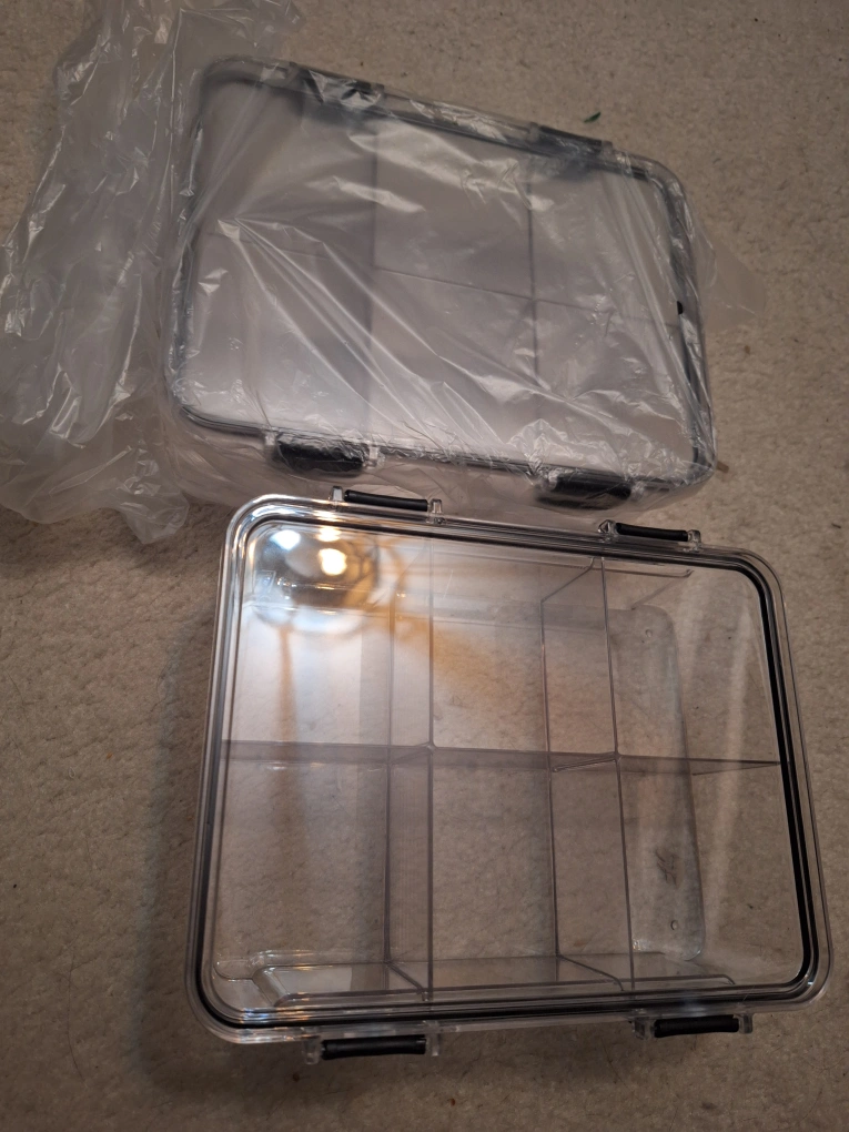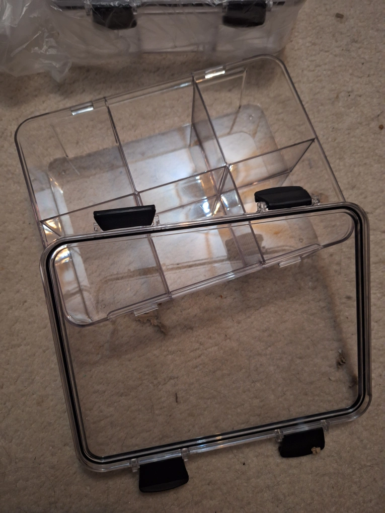 I have two clear plastic storage boxes for sale! It has dividers inside, perfect for organizing small items. It's in new condition and ready for a new home $8 each or both for $15