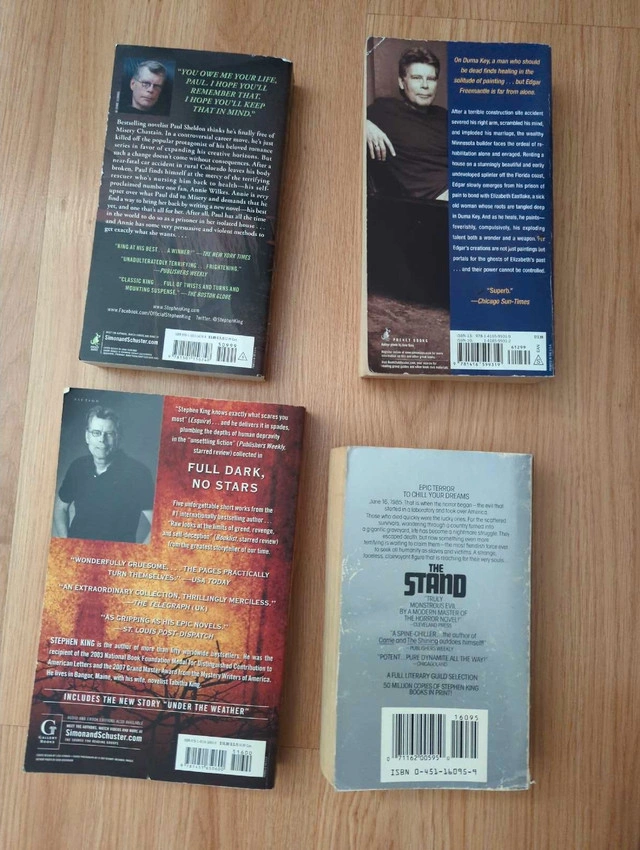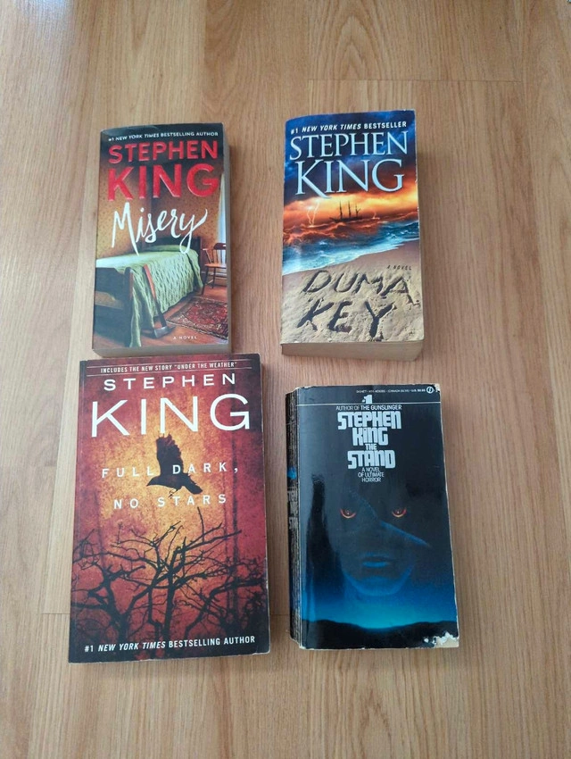 Selling a set of four Stephen King novels, perfect for any fan of horror and suspense! This collection includes "Misery", "Duma Key", "Full Dark, No Stars", and "The Stand". All books are in used condition, showing some signs of wear, but are entirely readable and ready to thrill. * **Titles**: Misery, Duma Key, Full Dark, No Stars, The Stand * **Author**: Stephen King * **Condition**: Used, with visible wear I have priced the set at $20. Considering the condition, this is a fair price. If the ad is still up, then these books are still available and waiting for a new home to fill with suspense and chills!