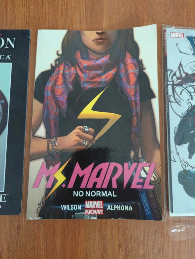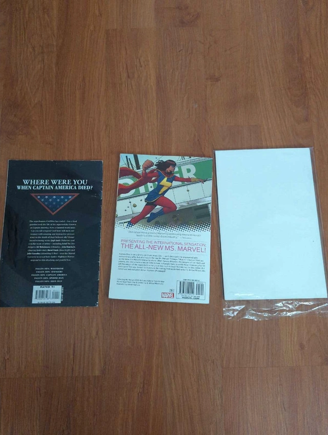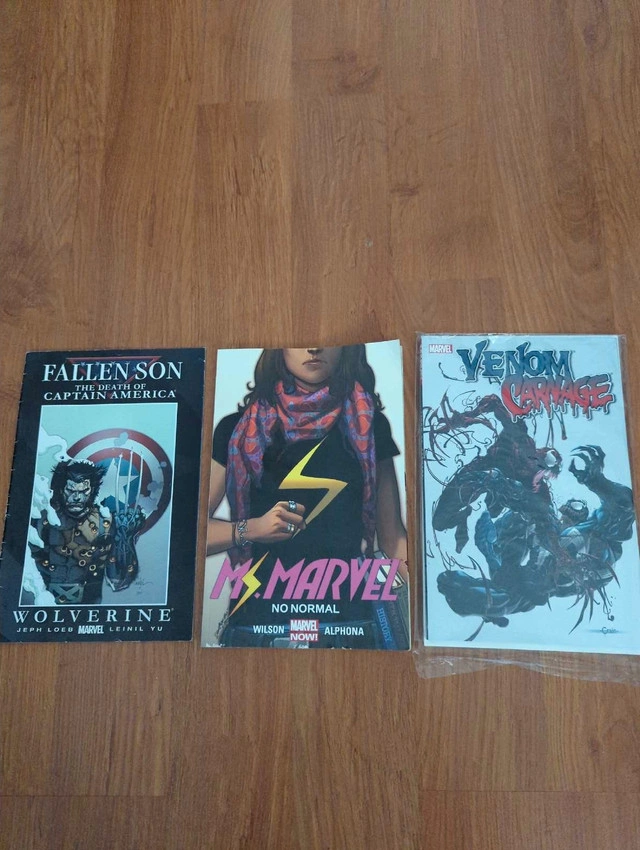 Dive into the Marvel universe with this collection of used comic books, including Fallen Son: The Death of Captain America, Ms. Marvel: No Normal, and Venom Carnage, each offering thrilling stories and captivating art. Titles: Fallen Son: The Death of Captain America, Ms. Marvel: No Normal, Venom Carnage. Condition: Used, with some visible wear but in good readable condition. I am pricing this lot at $25.00 CAD. I am offering a discount for purchasing them all together. Cash accepted. Cashless payment accepted.