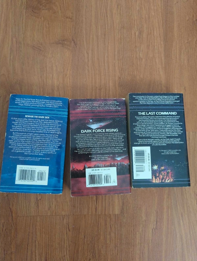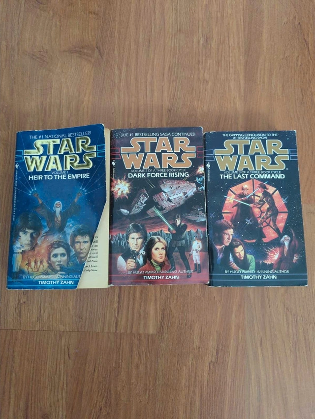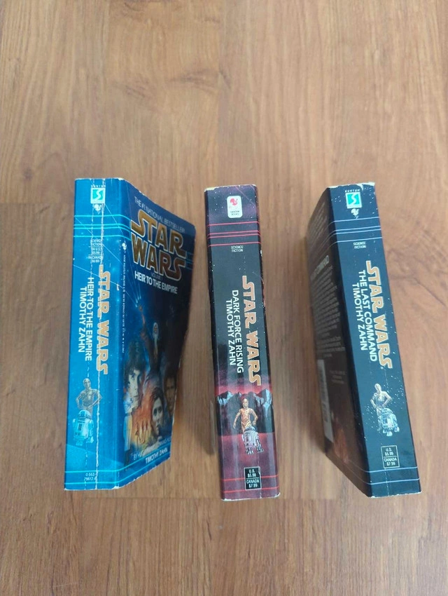 Dive into the Expanded Universe with this used set of the Star Wars Thrawn Trilogy books by Timothy Zahn, perfect for any Star Wars enthusiast looking to explore beyond the films. This collection includes "Heir to the Empire", "Dark Force Rising", and "The Last Command". As these books have been enjoyed, they do show wear, adding character to these galactic adventures. If the ad is up, the books are still available!