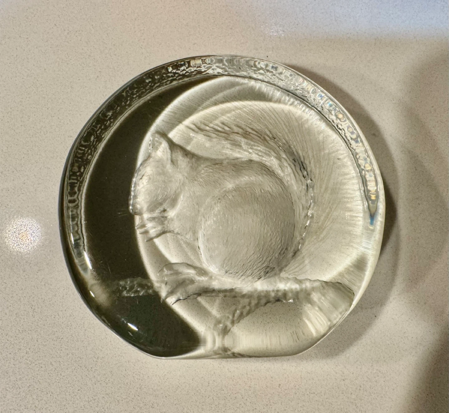 ✨Royal Collection Handcrafted Crystal Paperweight✨ This is a beautiful crystal paperweight from the Royal Collection, handcrafted with a detailed squirrel design inside. It comes in its original wooden box and measures approximately 4 inches in diameter. It's a lovely piece for any desk or collection.