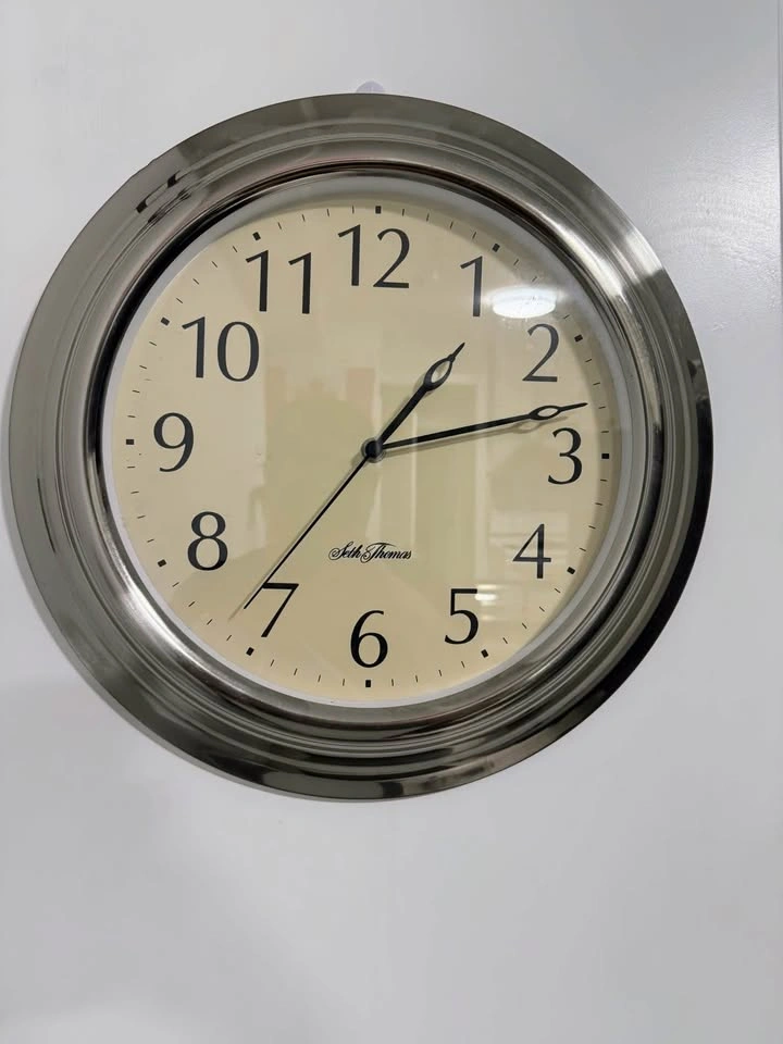 Wall clock Seth Thomas, Metal Stainless Steel. Perfect condition! This beautiful silver round wall clock is a timeless piece that will add a touch of elegance to any room. With a quartz power source, it keeps perfect time and the non-numeric marks give it a classic look. Manufactured in 2012 by Atlanta, this original clock has an analog display and runs on battery, making it easy to install in any room, even the bathroom. Measuring 15 inches in length and 2 inches in height, it is the perfect size for any wall.