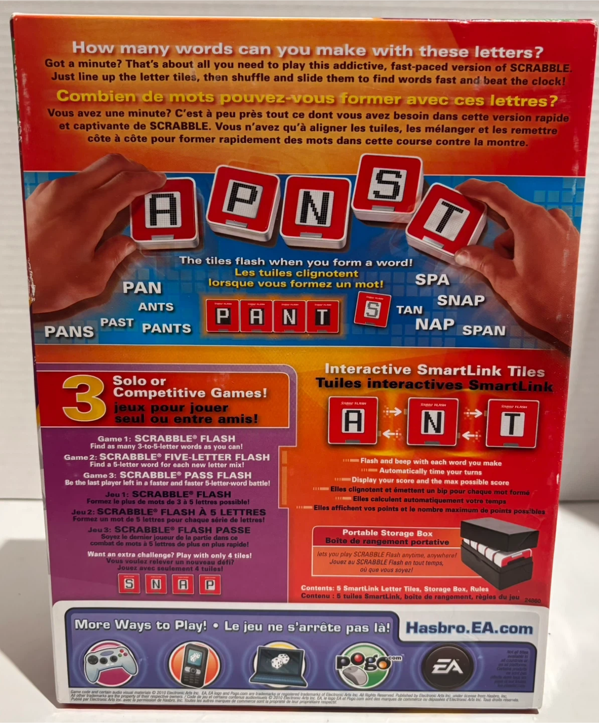 Selling an electronic Scrabble Flash game by Hasbro! It's a fun, fast-paced word game for ages 8+. Slide, swap, and shuffle the tiles to find words fast. It includes interactive SmartLink tiles and has 3 solo or competitive games. Batteries are included!