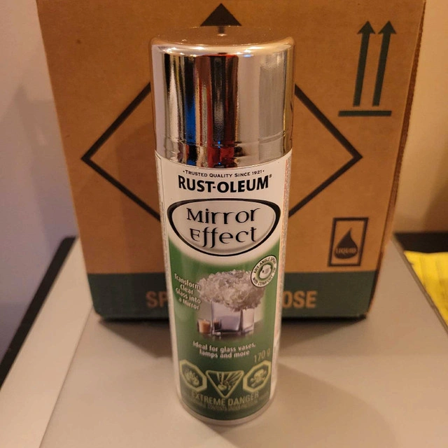 Rust-Oleum Specialty Mirror Effect, 170 G Aerosol Spray Paint. I have Gold (6 cans) Silver (6cans) Asking $20 each or $80 for 6. All New. For Sale By Owner. Curbside pick up available. Cash accepted.