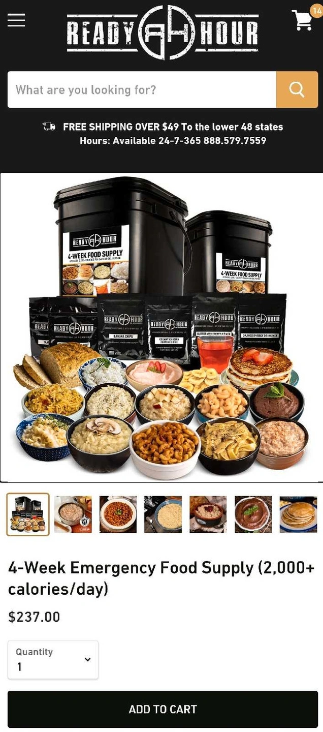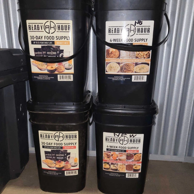 2 kits available, $180 each. Sells for $250 USD online. Imagine the peace of mind you'll have knowing no matter what happens—natural disasters, food shortages, economic troubles, and more—there will always be food on your table. This 4-Week Emergency Food Supply is your first and best step to that peace of mind and all the security it provides. PRODUCT DETAILS 2,000+ calories a day for 1 person for 4 weeks 55,900 total calories 254 servings of hearty meals Shelf life of up to 25 years* Buckets measure 9.75" x 11.75" x 15.75" WHAT'S INCLUDED? With 16 delicious food varieties, you’ll never get bored with breakfast, lunch, or dinner. Breakfasts Buttermilk Pancakes – 30 Servings** Maple Grove Oatmeal – 32 Servings Strawberry Flavored Creamy Wheat – 8 Servings Entrées Mac & Cheese – 8 Servings Creamy Stroganoff – 8 Servings Chili Mac – 8 Servings Creamy Alfredo Pasta – 4 Servings Sides Creamy Chicken Flavored Rice – 16 Servings Southwest Rice – 24 Servings Long Grain White Rice – 30 Servings Mushroom Rice Pilaf – 16 Servings Honey Wheat Bread – 24 Servings Snacks & Desserts Banana Chips – 16 Servings Chocolate Pudding – 10 Servings Rice Pudding – 8 Servings Drinks Orange Energy Drink Mix – 8 Servings All foods and drinks are easy to prepare! Just add water and follow the cooking directions, if any. *Store in a dark, cool place with temperatures ranging from 55°F to 70°F. Cooler is better with Ready Hour Foods; long-term heat can cause premature product expiration. **Servings based on 4-inch pancakes. Note: Based on inventory levels, Ready Hour may substitute a food and/or drink product with like items of equal or greater value to expedite delivery. Total water needed to prepare entire kit is approximately 9.8 gallons. Contains 31.38 pounds of food