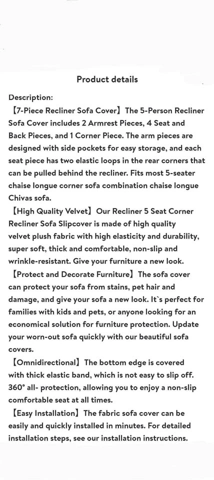 Brand new, never opened. 5 Seater Recliner Cover 7 Piece Velvet Recliner Corner Sofa Cover Stretch L Shape Reclining Sectional Couch Covers for 5 Cushion Sofa Slipcovers (black) More product details and measure guide in pictures. Let me know if you're interested!