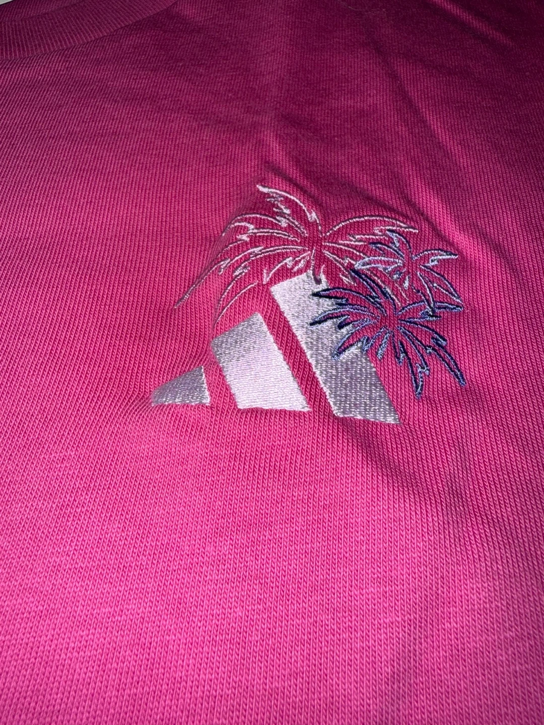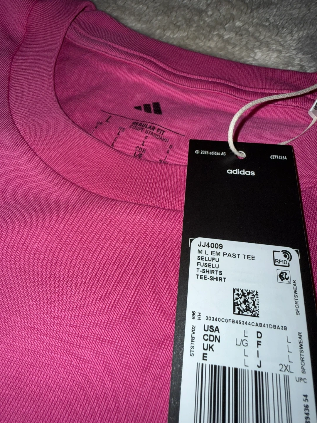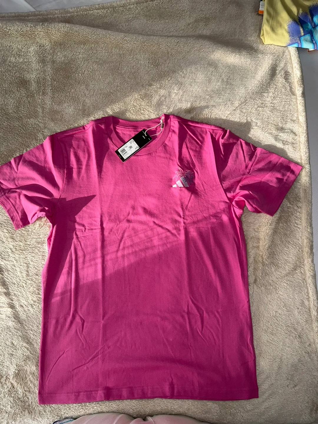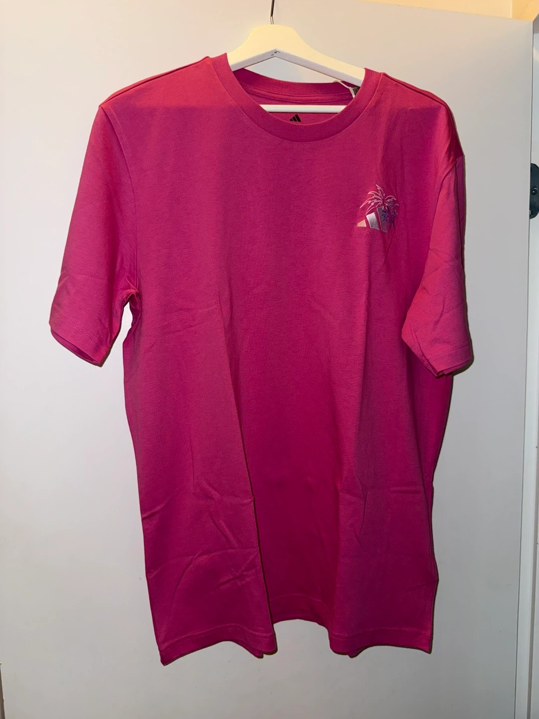 Selling a brand new Adidas JJ4009 tee in a vibrant fuslu (pink) colour! It's a size L and has a cool palm tree design. This tee is a regular fit and made for comfort. Perfect for adding a pop of colour to your wardrobe!