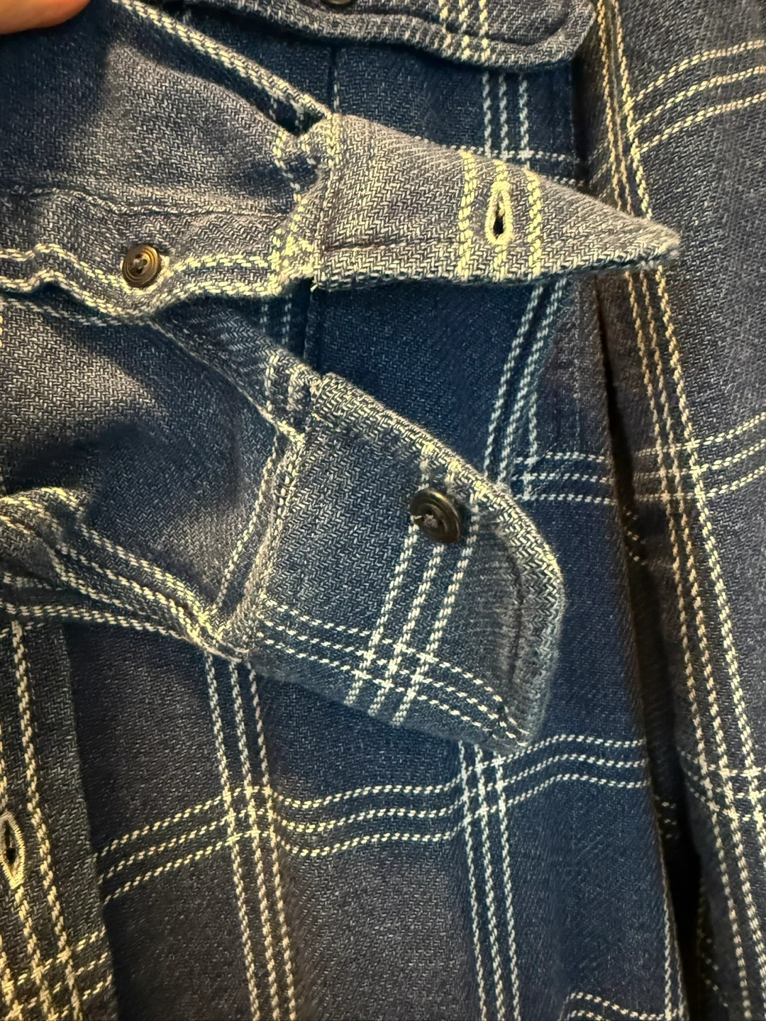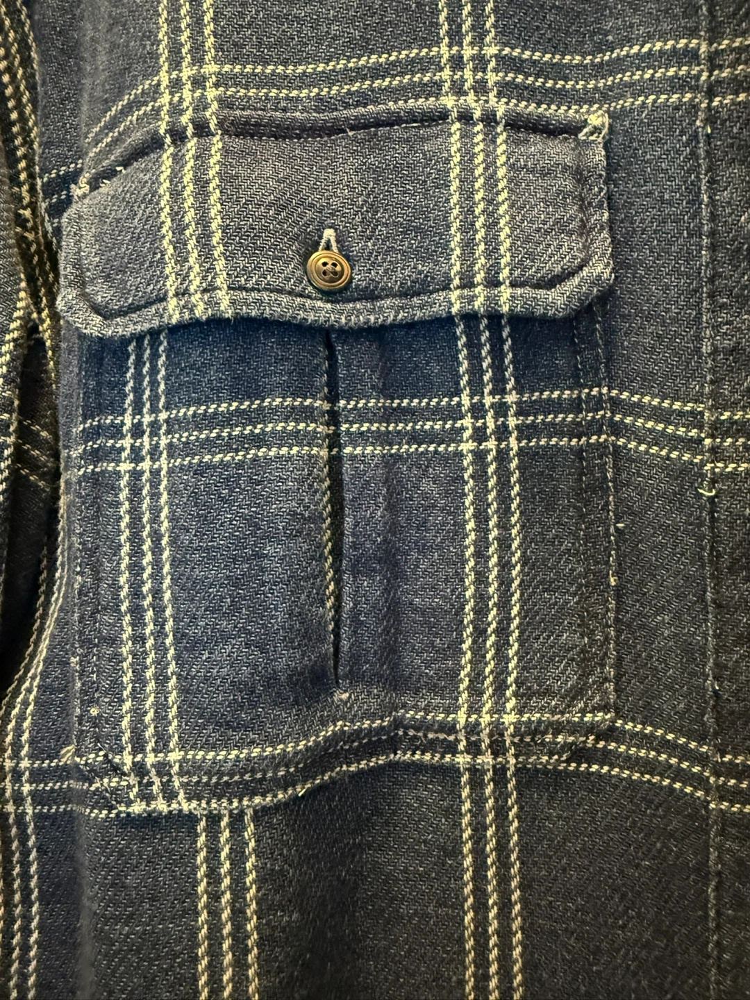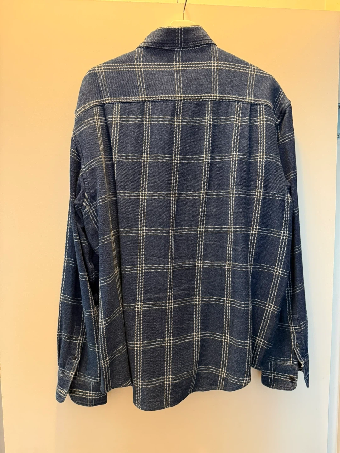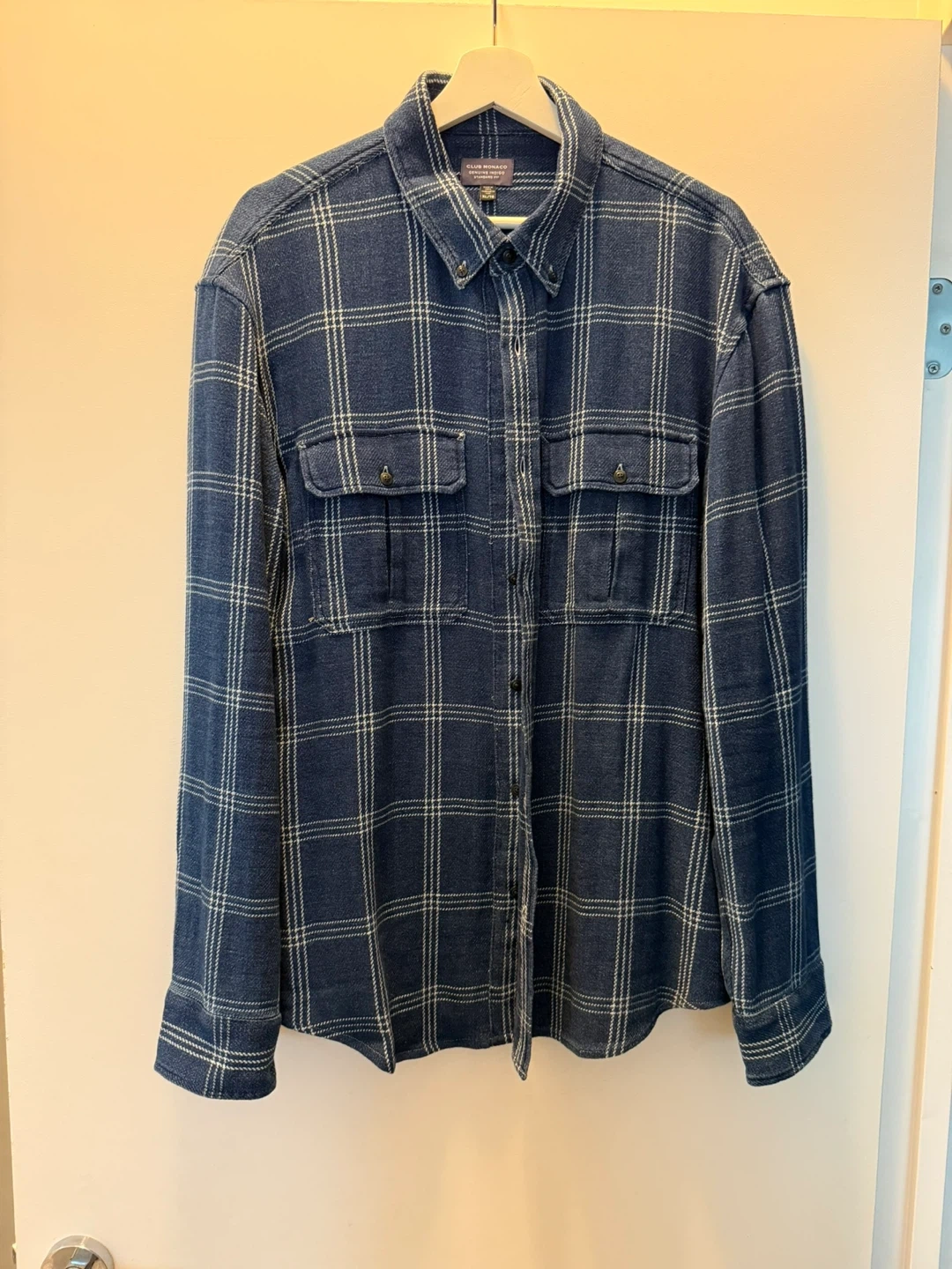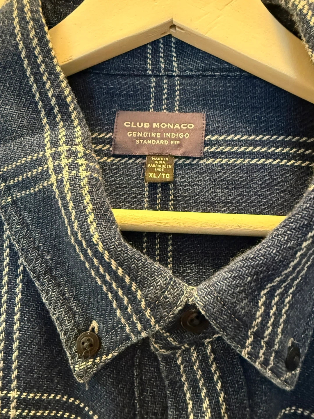 Here's a Club Monaco Genuine Indigo Standard Fit flannel shirt. It's a size XL. The shirt is a blue and white plaid pattern. Perfect for layering or wearing on its own!