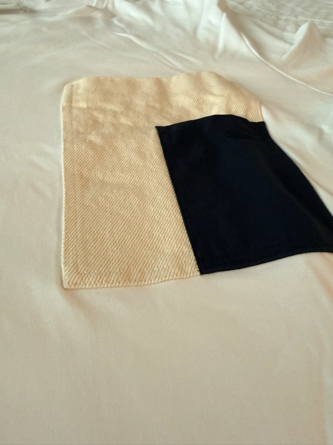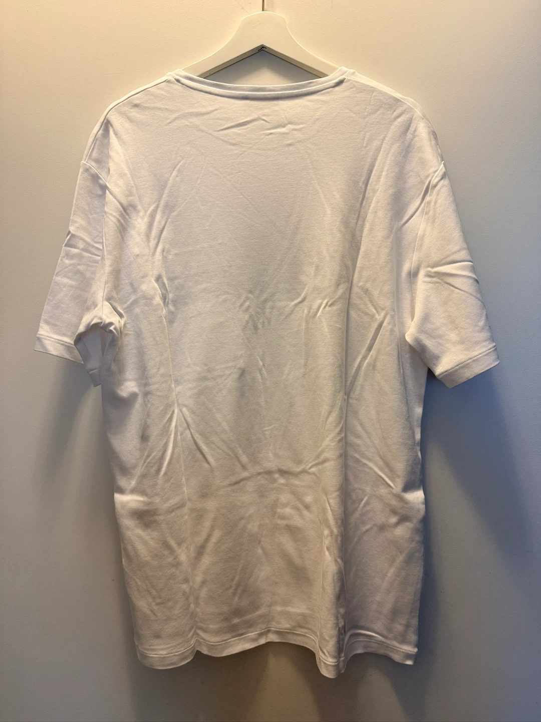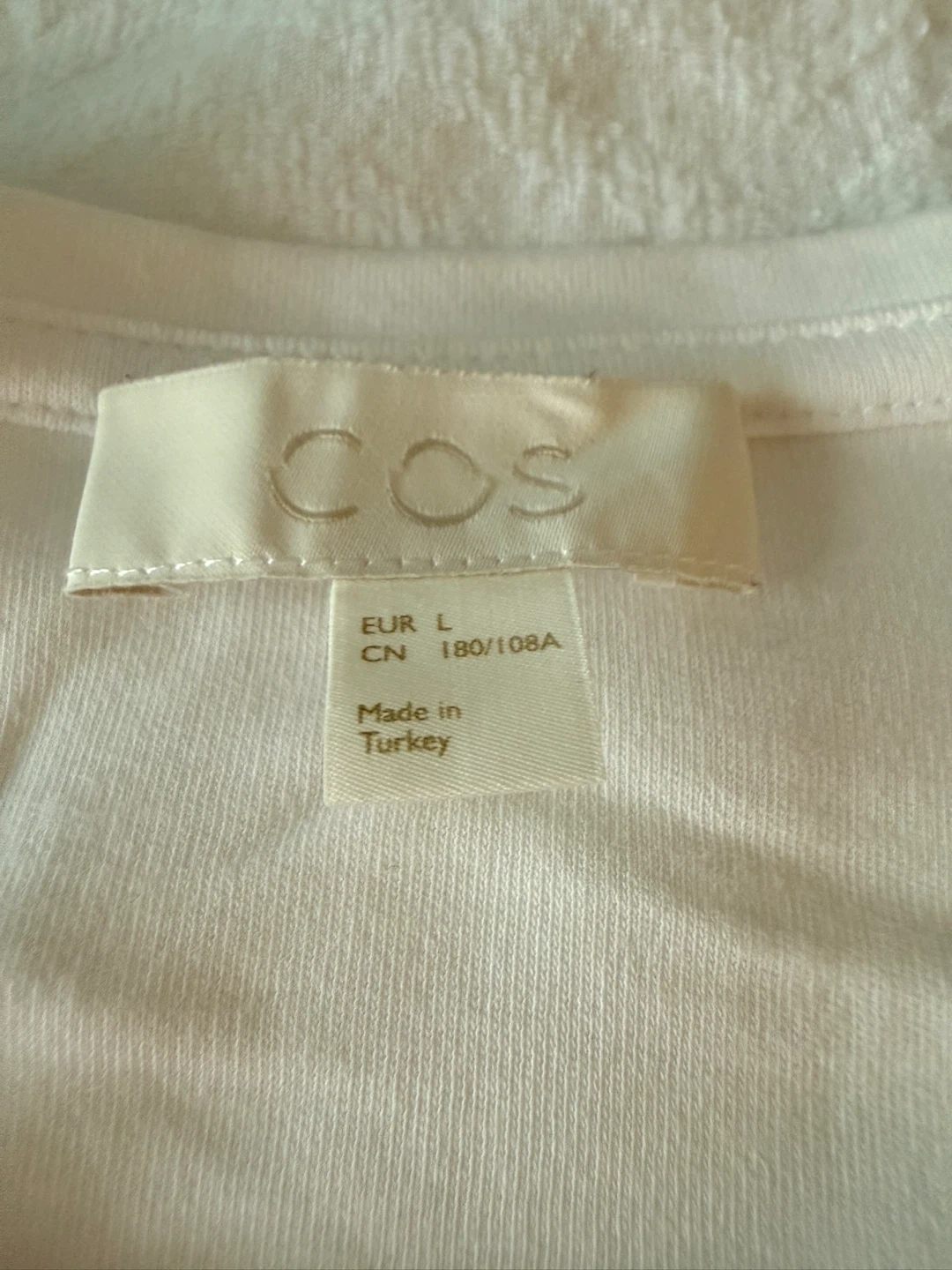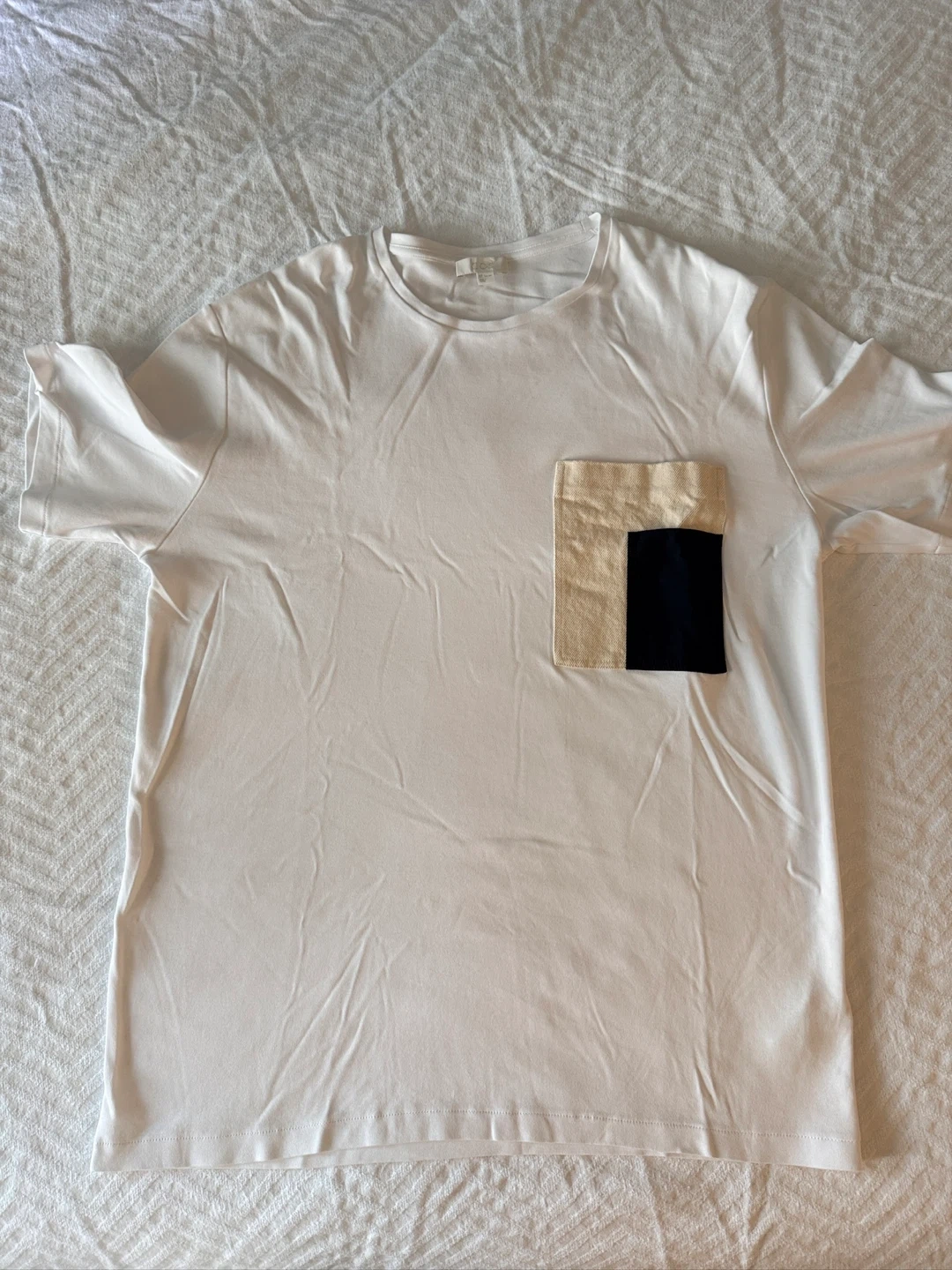 Selling a COS white t-shirt in size large. It features a unique pocket design with beige and black colours. The shirt is in great condition and ready for a new home!