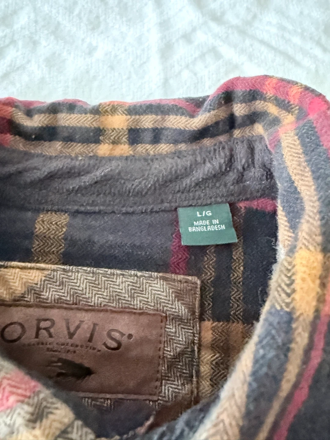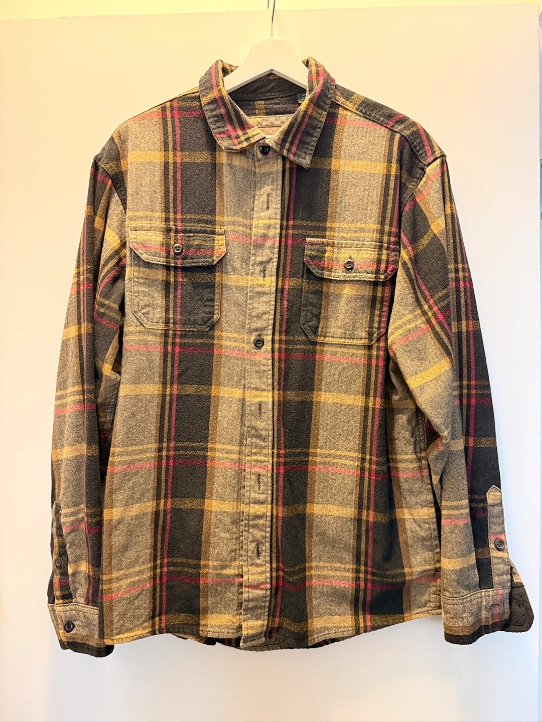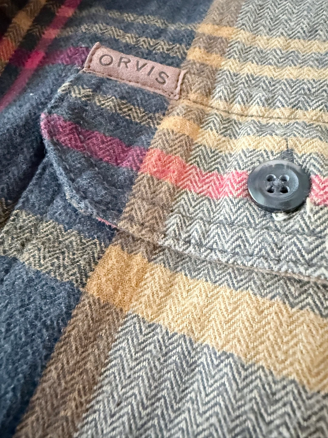 83Cozy Orvis flannel shirt in a size large. It features a classic plaid pattern with hues of grey, yellow, and pink. Great for layering or wearing on its own!