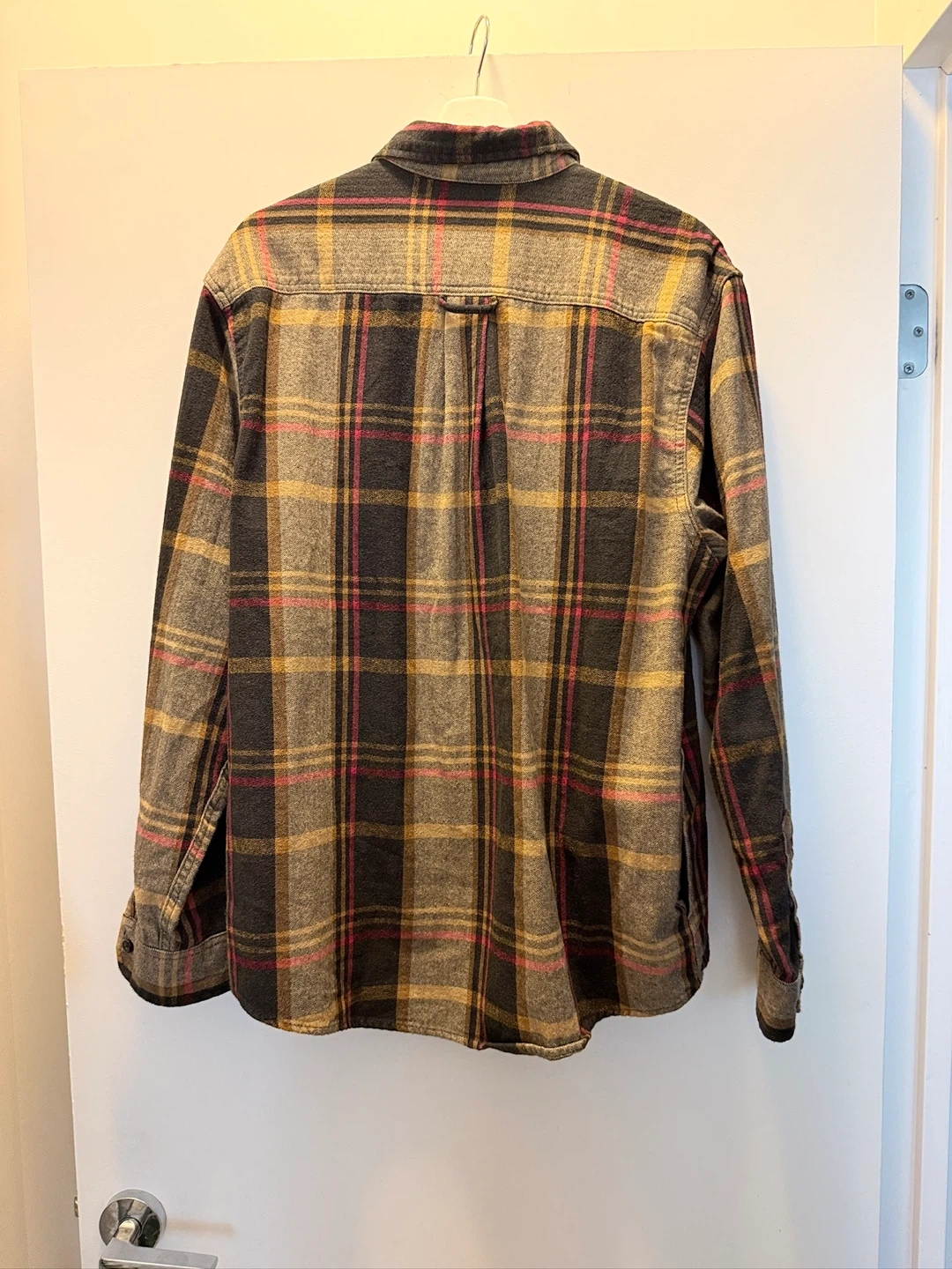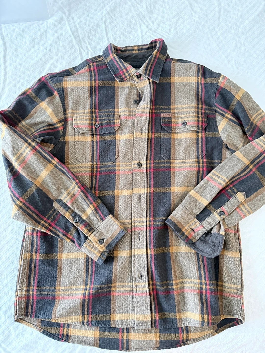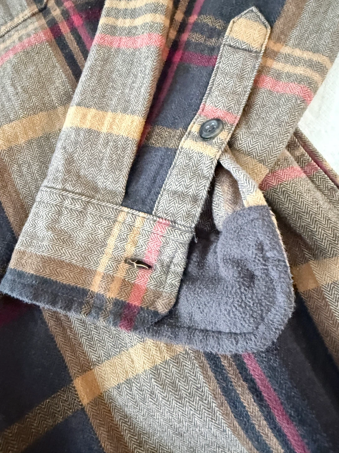 83Cozy Orvis flannel shirt in a size large. It features a classic plaid pattern with hues of grey, yellow, and pink. Great for layering or wearing on its own!