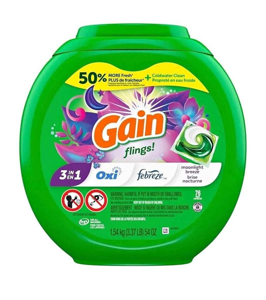 Gain Flings Laundry Detergent Pacs, Moonlight Breeze Scent, 3 in 1 HE Detergent Pacs with Oxi Boost and Febreeze, 76 Count