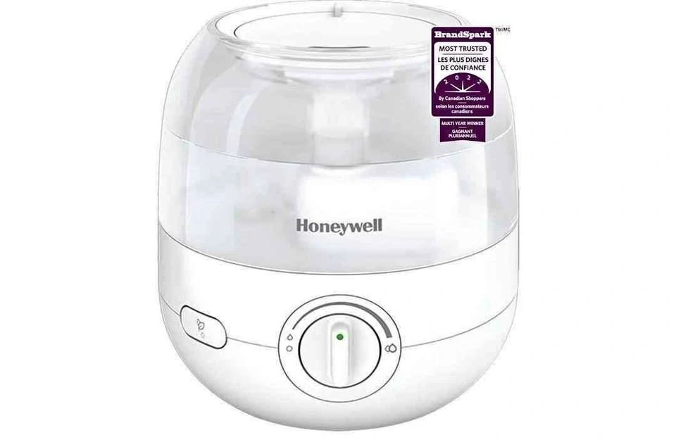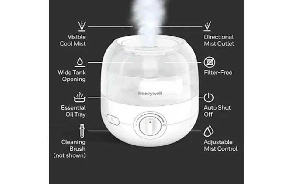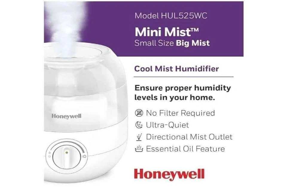 Barely used Honeywell HUL525WC Mini Mist™ Ultrasonic Cool Mist Humidifier, White, with Essential Oil Tray, Variable Output Control, Auto Shut-off, Ultra Quiet Operation, Directional Mist Outlet, Cool Visible Mist